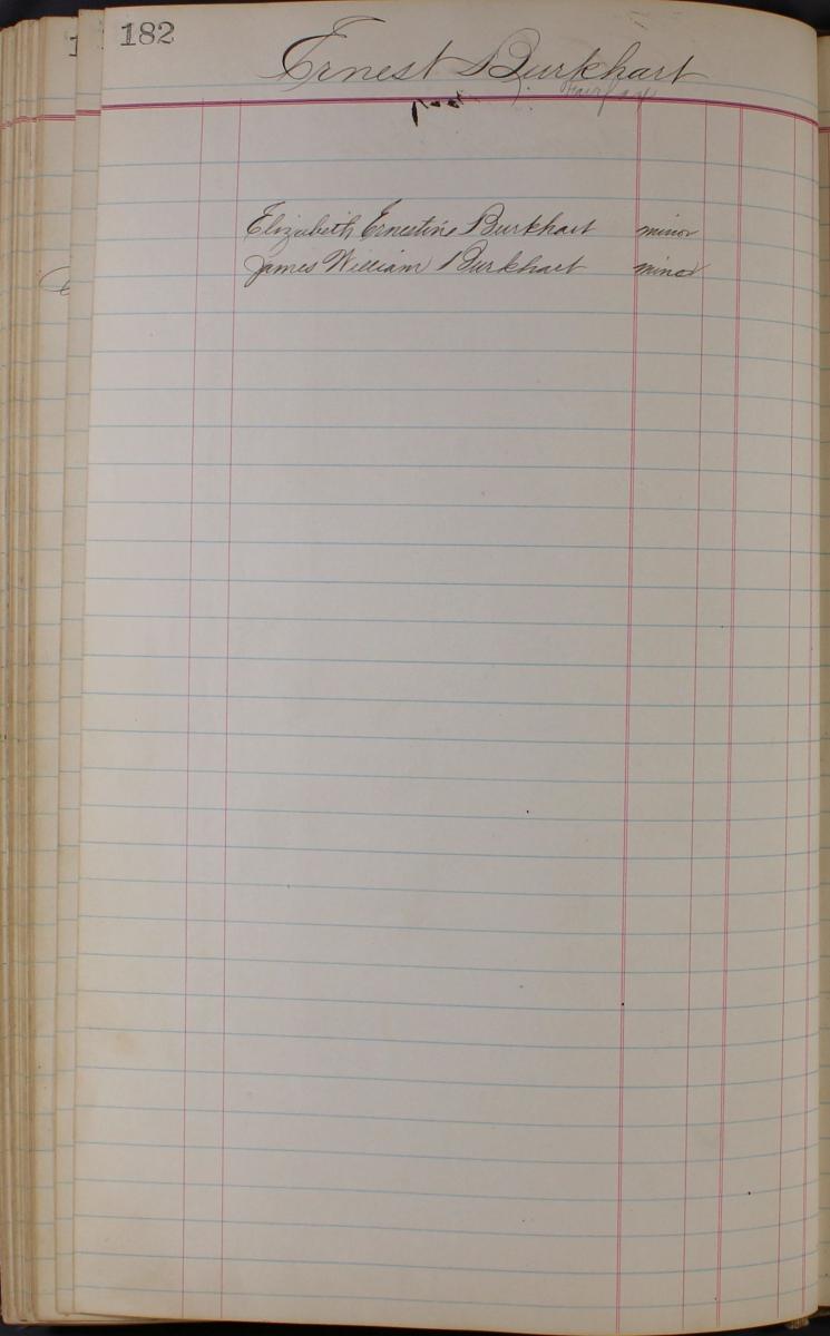 This is a page from the register of guardians of minor and “incompetent” Osage Indians. The Osage Indians at one time were considered some of the wealthiest people in the world due to the oil found on the land they owned in Oklahoma. The register lists guardians of Osage Indians who were deemed unfit to have control of their own money. Mollie Burkhart, an Osage, and her family were victims of William K. Hale, who masterminded the killing of several Osage Indians in order to inherit headrights (oil rights) and money. Hale solicited his nephew Ernest Burkhart to help carry out his crimes. Ernest and Mollie married, but he was eventually arrested for his involvement in the death of her family members. In the register, Ernest is listed as the guardian for their children, Elizabeth Ernestine and James William Burkhart. The Osage refer to this time as the Reign of Terror.