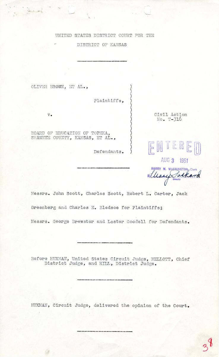 This document is the Opinion in the landmark civil rights case Brown v. Board of Education of Topeka, dated August 3, 1951.