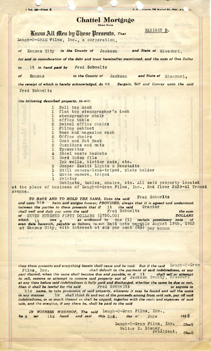 This document is an exhibit in bankruptcy case 4457, In the Matter of Laugh-O-Gram Films, Inc. Filed in 1923, this bankruptcy case marked the final demise of a small Kansas City animation studio. This exhibit is a mortgage of property from Laugh-O-Gram Films, Inc., including common office furniture, as well as equipment for making cartoons. The name of the president of the company appears at the bottom of the document: Walter E. Disney.