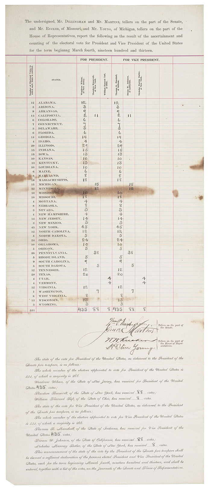 The Twelfth Amendment to the United States Constitution requires that after a presidential election the U.S. House of Representatives and the U.S. Senate meet to count the electoral votes. On February 12, 1913 the House and the Senate met in a joint session to count the votes from the 1912 presidential election. The major candidates in the election were unpopular incumbent President William Howard Taft (Republican Party), former President Theodore Roosevelt (Progressive "Bull Moose Party) and New Jersey Governor Woodrow Wilson (Democratic Party). Wilson handily defeated Taft and Roosevelt winning 435 of the 531 available electoral votes. Wilson also won 42% of the popular vote, while his nearest challenger, Roosevelt, won just 27%. Eugene Debs, who had run on the Socialist Party ticket, won an impressive 6% of the popular vote but failed to receive a single electoral vote.
