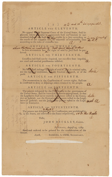 On September 2, the Senate began considering amendments to the Constitution as proposed and passed in the House. They altered and consolidated the House amendments into 12 articles on September 9, 1789 to make up the document below.