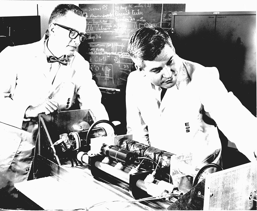Private organizations have served as indispensable partners to the civilian space program since NASA’s formation and have shared in its success. Here, Dr. Paul C. Fletcher and Mr. Duane D. Erway, employees of Electro-Optical Systems, Inc. (EOS), test a NASA-funded laser beacon for the Gemini Program. The beacon emitted a pencil-thin beam from Earth into the upper atmosphere. NASA and EOS hoped that the beacon might serve as an alternative communication system for manned flights if it was visible from the spacecraft while in orbit.