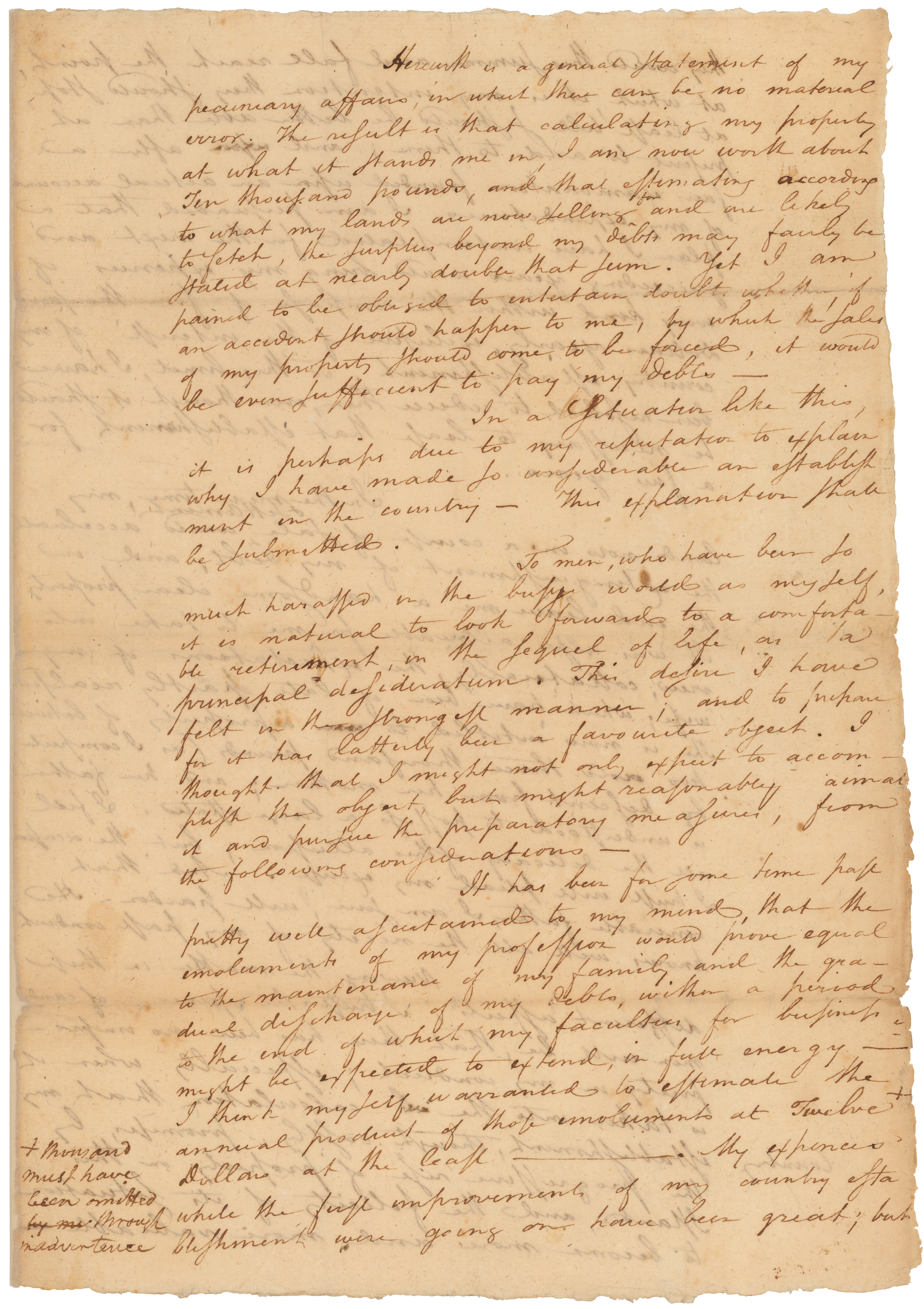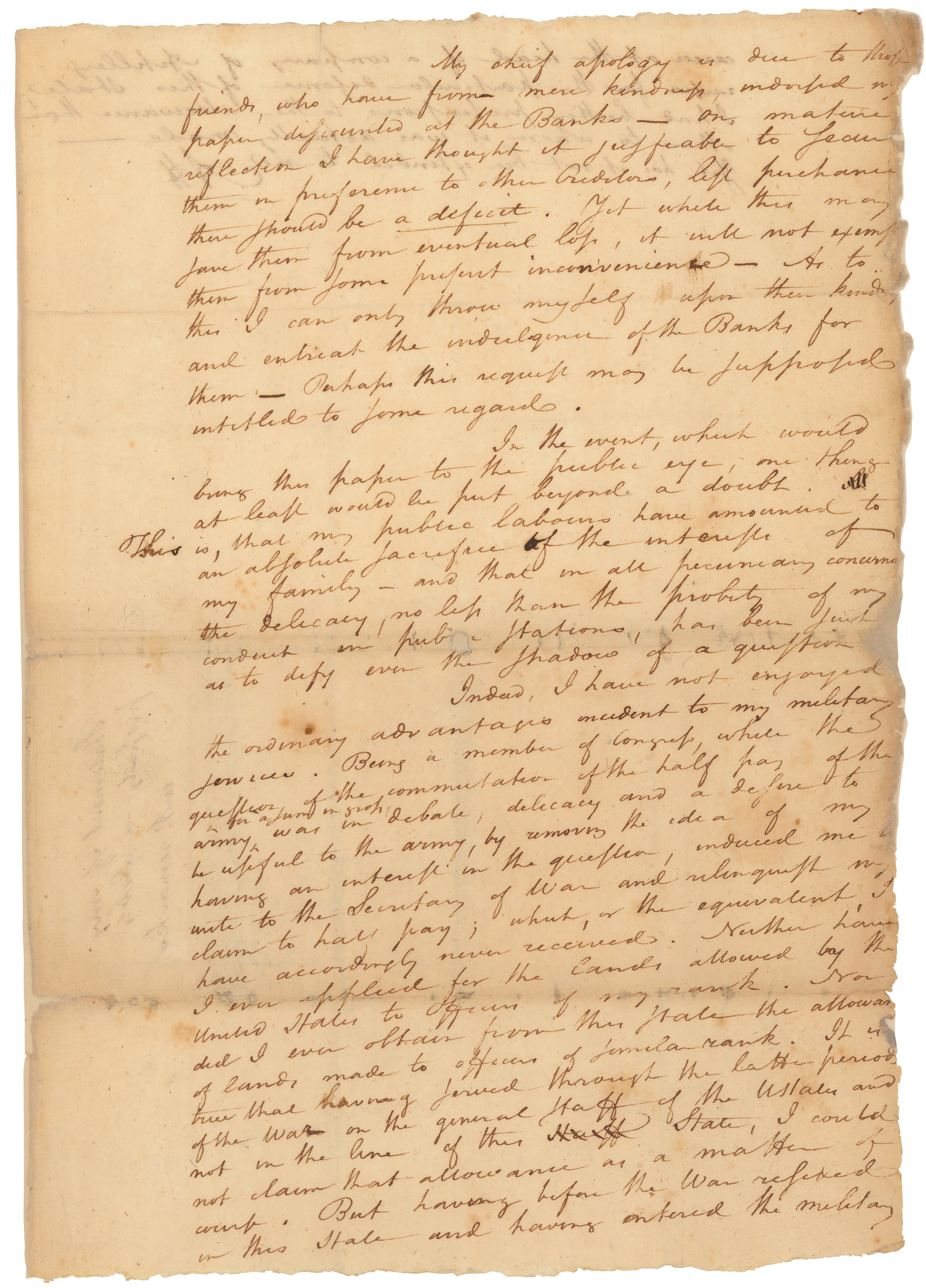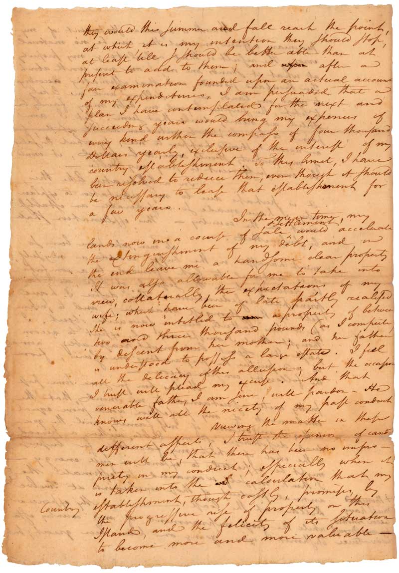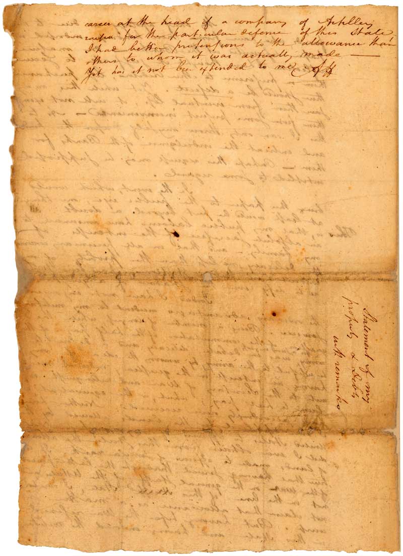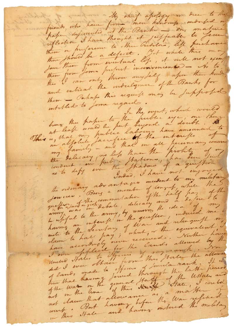 In her petition, presented to the House of Representatives on May 30, 1809, Elizabeth Hamilton asked Congress to restore her husband's right to a pension. Along with her petition, she submitted Hamilton's October 28, 1783 Commission as Lieutenant Colonel for the Revolutionary Army and a personal statement of his property and debts. Believed to be written on July 1, 1804, just days before he died, Hamilton's statement is an explanation of his financial circumstances "if an accident should happen to me." In it, he ties his public service to the present state of his finances, which included debts that would prove a burden to his family.