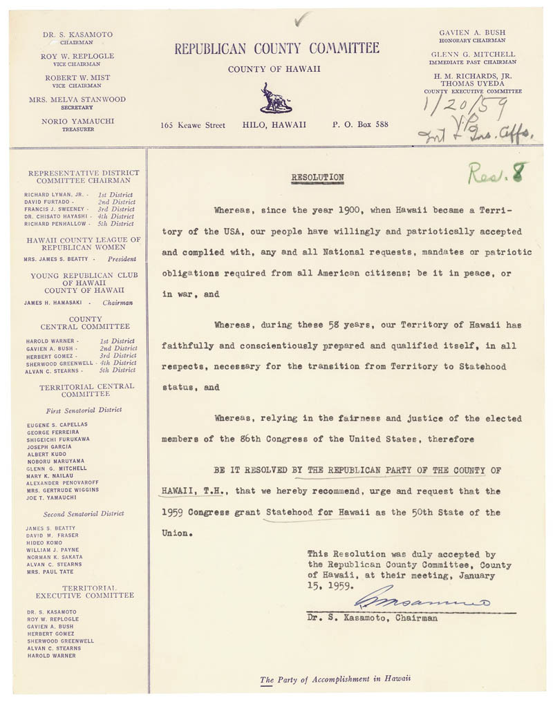 Resolution of the Republican County Committee, County of Hawaii, January 15, 1959