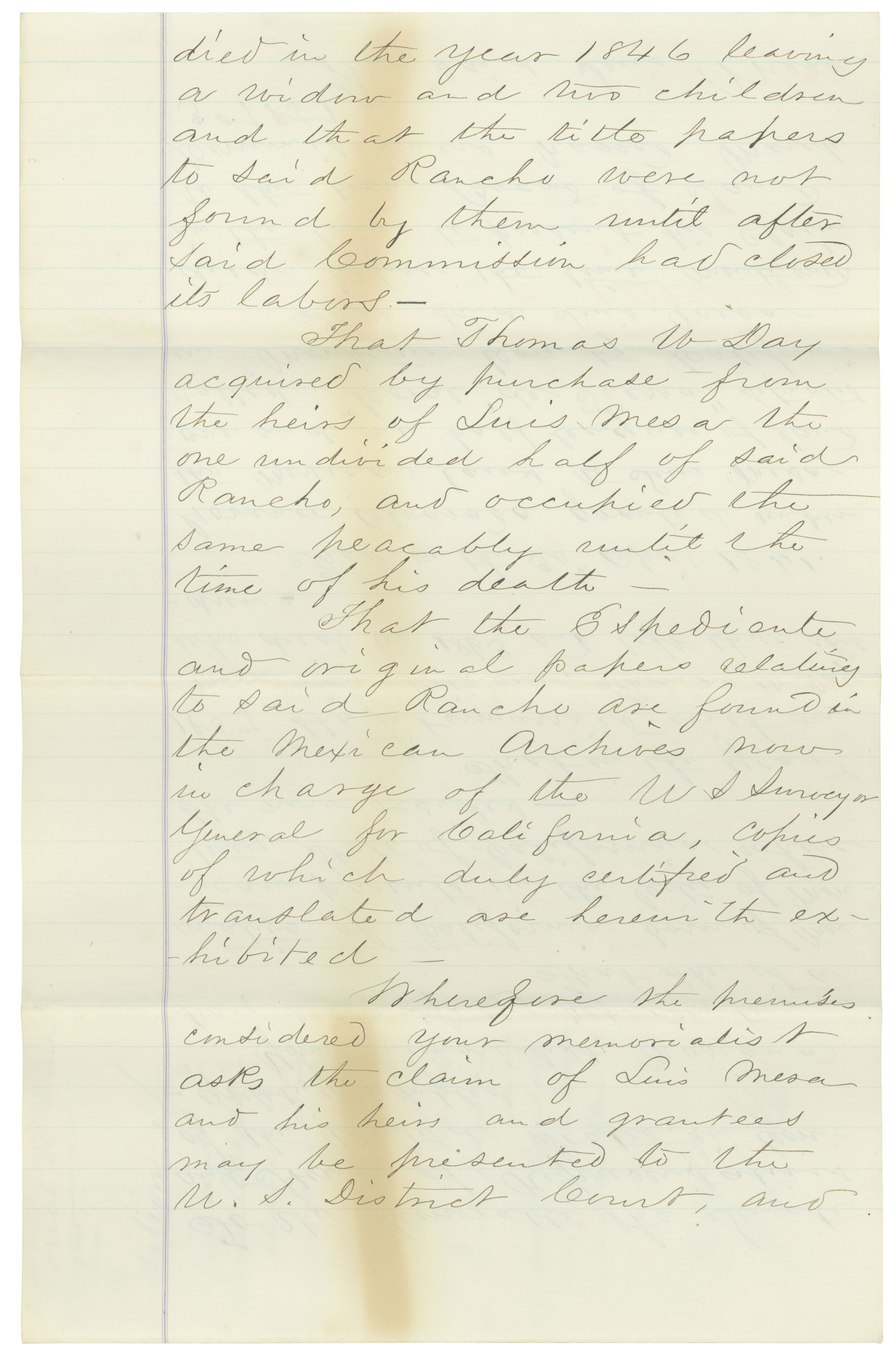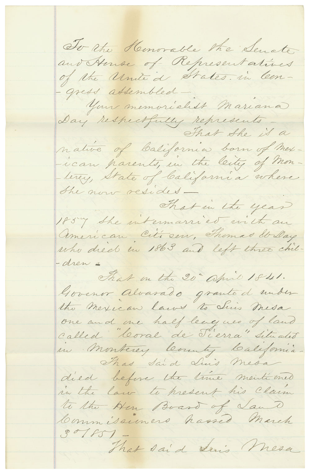 Among the papers sent to Congress to prove ownership of the land was a letter from Mariana Day—a former Mexican citizen married to an American and the current occupant of a portion of the land. Her husband, Thomas Day, had purchased the land from Luis Mesa before he died.