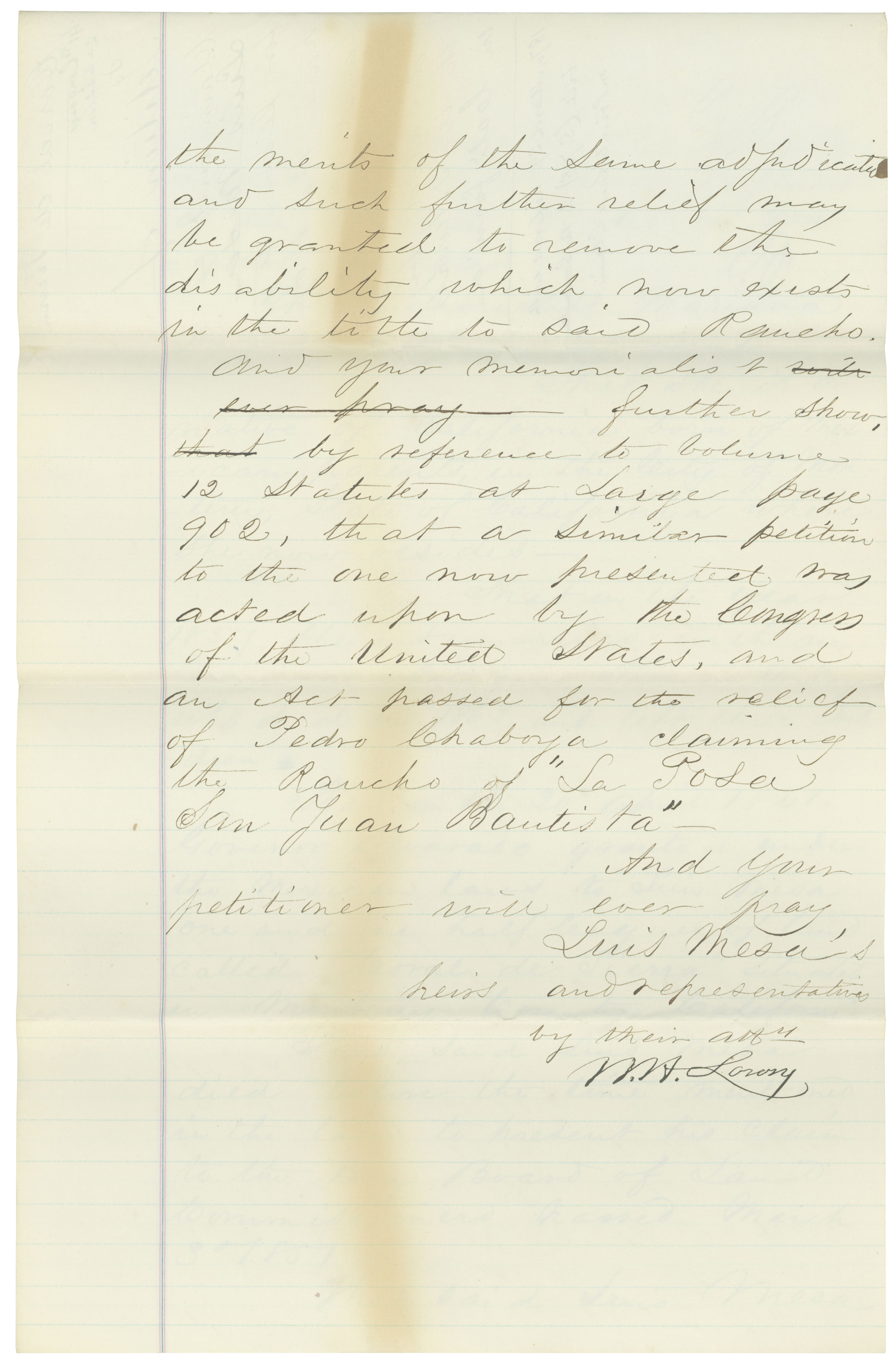 The memorialist, Mariana Day, requested that the claim of the heirs of Luis Mesa "be presented to the U.S. District Court" so that "relief may be granted to remove the disability which now exists in the title to said Rancho." Mrs. Day referenced a similar case that was decided in favor of the petitioner as evidence that the request was legitimate.