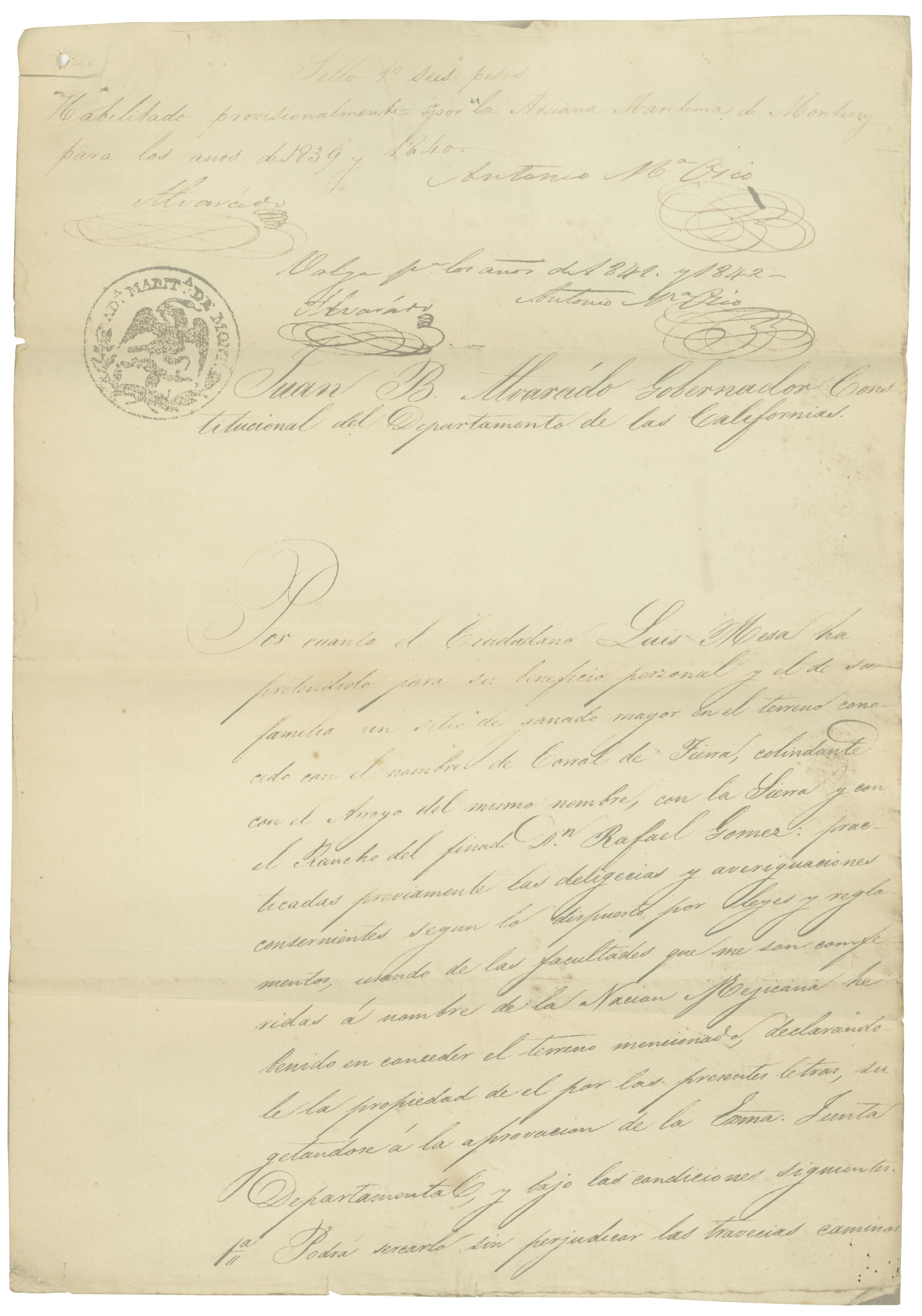 First page of Luis Mesa's original 1841 title to "Corral de Tierra" from the Mexican government; Records of the United States Senate, RG 46.