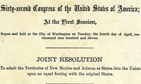 Among the historical records of the U.S. House of Representatives and the U.S. Senate at the Center for Legislative Archives are many documents that illustrate the important role Congress plays in the creation of states. For both New Mexico and Arizona, the road to statehood was protracted and contentious. However, after much effort, on January 6, 1912 New Mexico became the 47th state and on February 14, 1912 Arizona became the 48th state in the Union. Both states celebrate their 100th anniversaries in 2012. Here is a sample of the many congressional records that document New Mexico's and Arizona's long journeys to statehood.