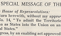 President William H. Taft's veto of H.J. Res. 14 to admit the Territories of New Mexico and Arizona as States into the Union, August 15, 1911