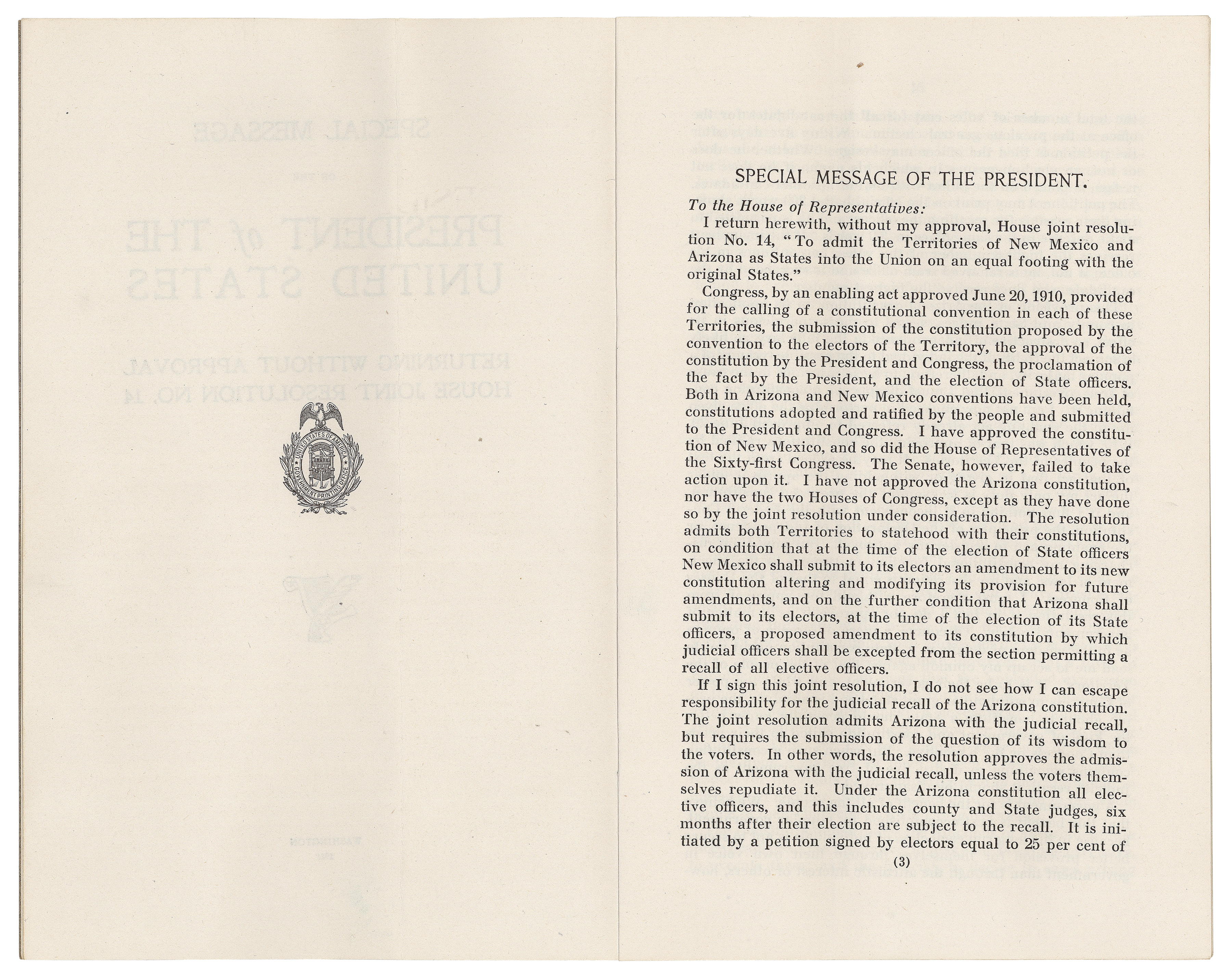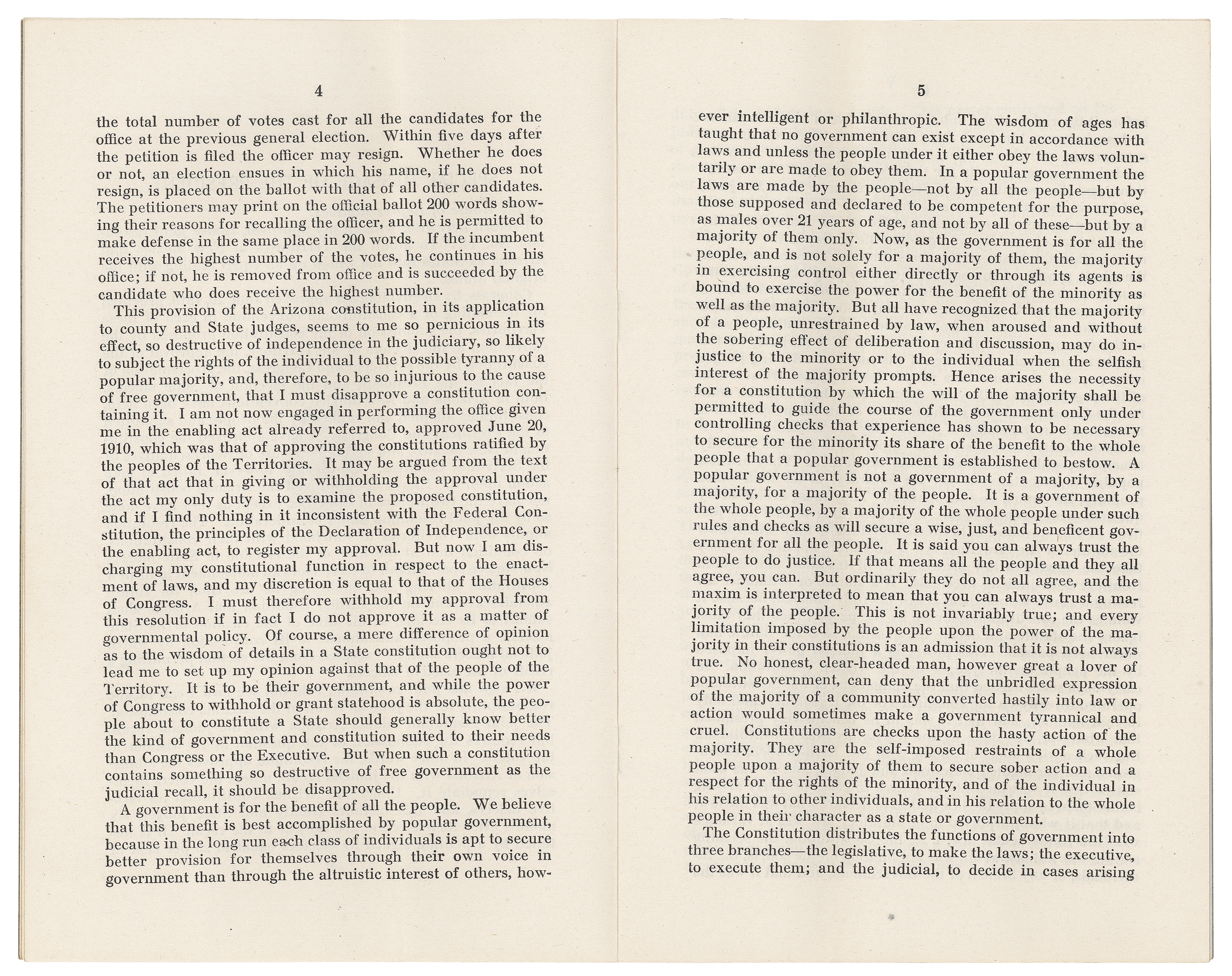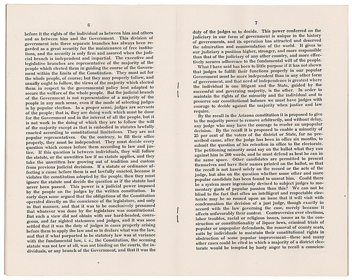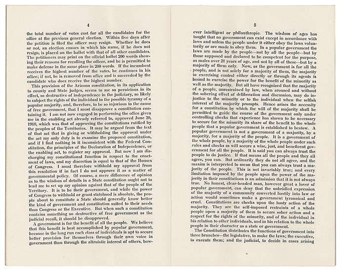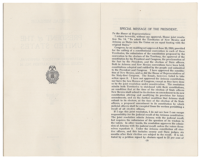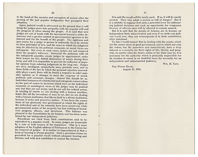 On August 15, 1911, President William Howard Taft vetoed the statehood resolution in large part because Arizona's constitution allowed for the recall of judges, a provision that he stated went against the need for an independent judiciary.