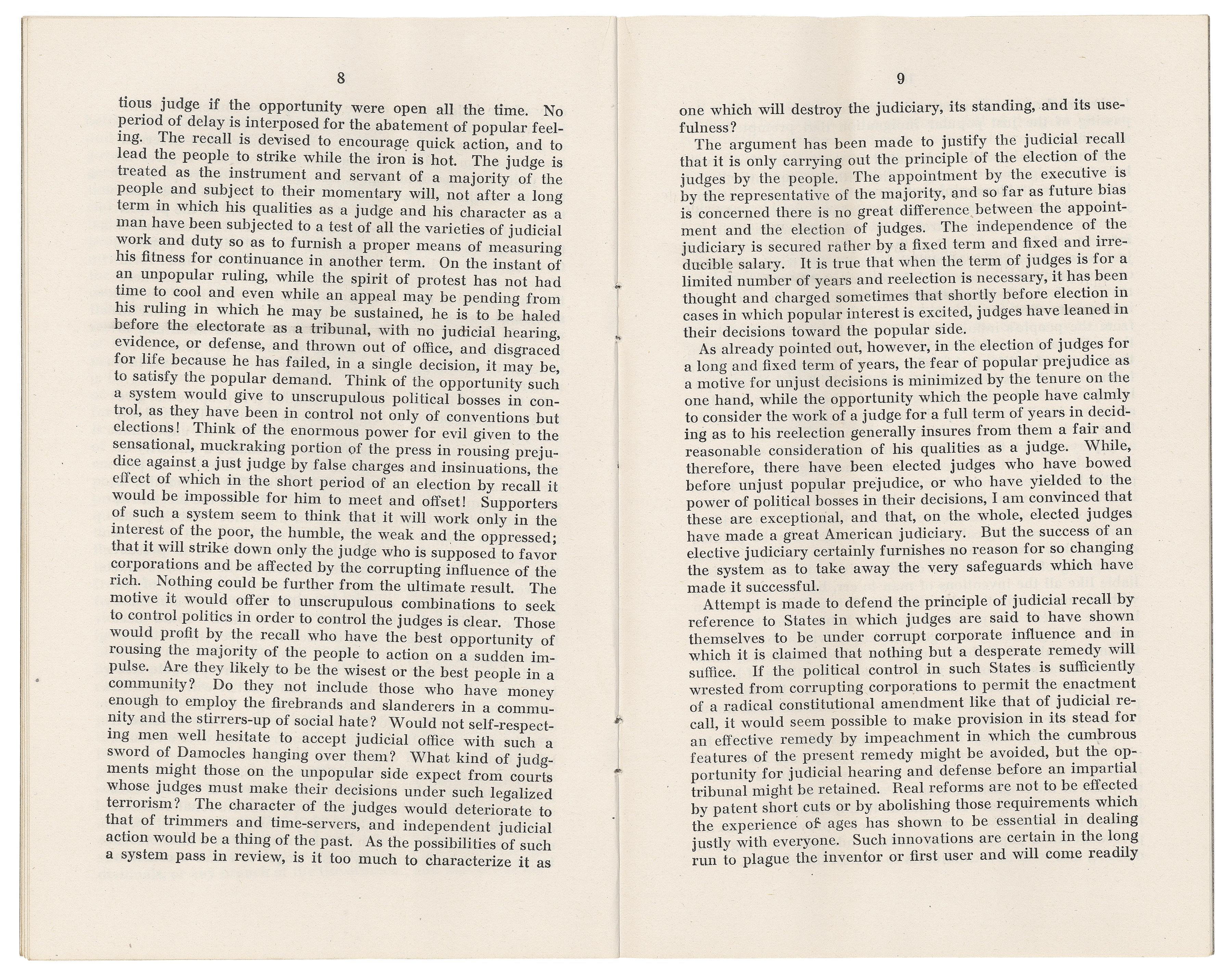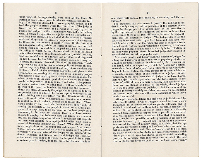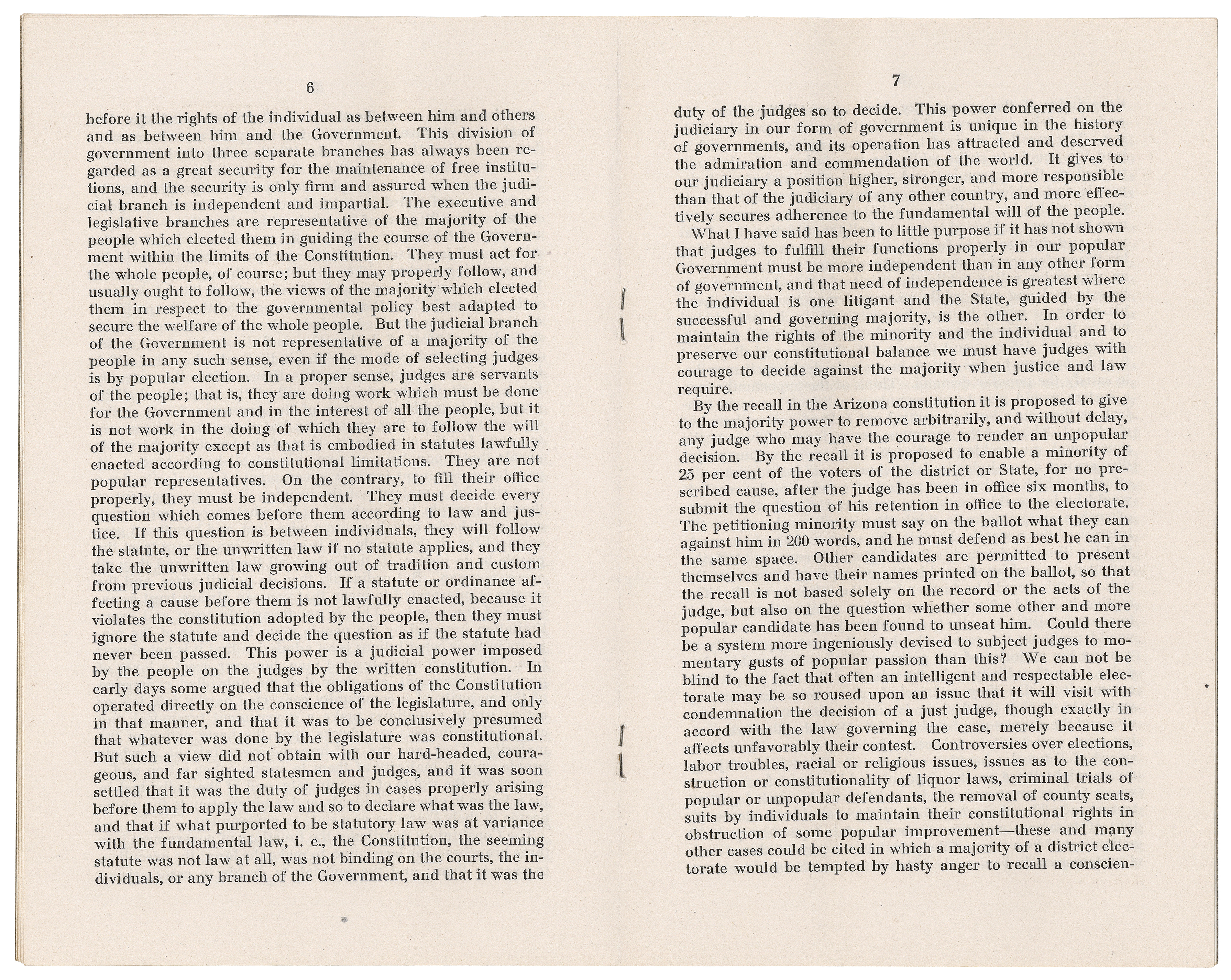 On August 15, 1911, President William Howard Taft vetoed the statehood resolution in large part because Arizona's constitution allowed for the recall of judges, a provision that he stated went against the need for an independent judiciary.