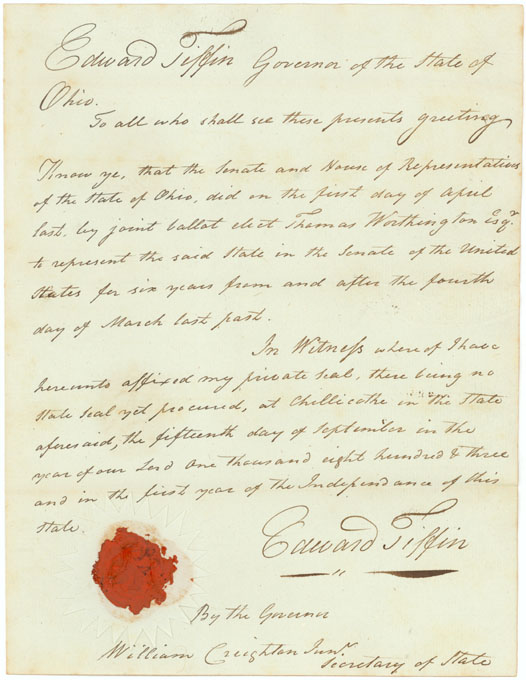 On February 19, 1803, Congress passed an act stating that the citizens of Ohio had adopted a constitution in accordance with the 1802 enabling act and the said state had become one of the United States of America. Ohio gained representation in Congress when Thomas Worthington, who was appointed as an Ohio Senator, presented his Credentials to the Senate on the first day of the 8th Congress. Although legally Ohio became the 17th state with the February 19, 1803 act of Congress, Ohio statehood is celebrated on March 1. The date of March 1, 1803 was when the Ohio legislature met for the first time. This was retroactively made the statehood date by a 1953 Resolution of the United States Congress.