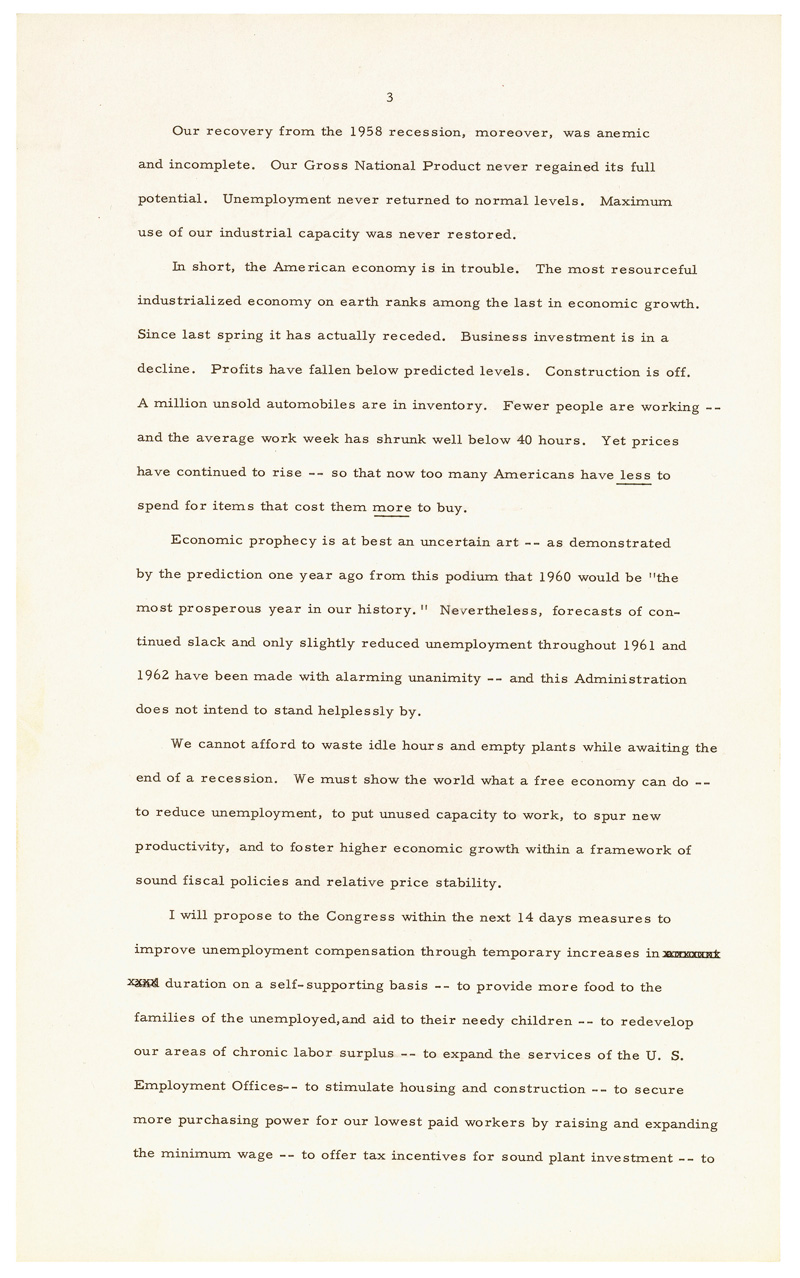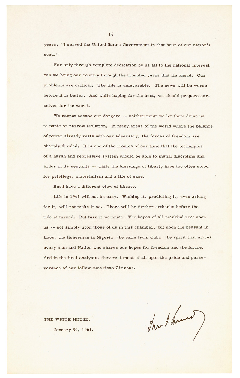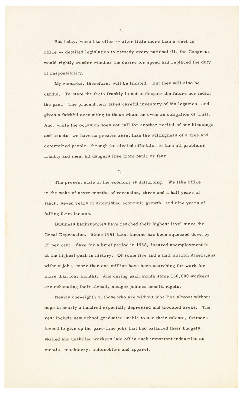 This message was given just 10 days after President Kennedy's inauguration, one of the few instances where the President chose to give a State of the Union at the beginning of his first term. In the message President Kennedy describes the country's economic turmoils and the perilous situation with foreign affairs. He candidly remarks that "Life in 1961 will not be easy. Wishing it, predicting it, even asking for it, will not make it so. There will be further setbacks before the tide is turned. But turn it we must."