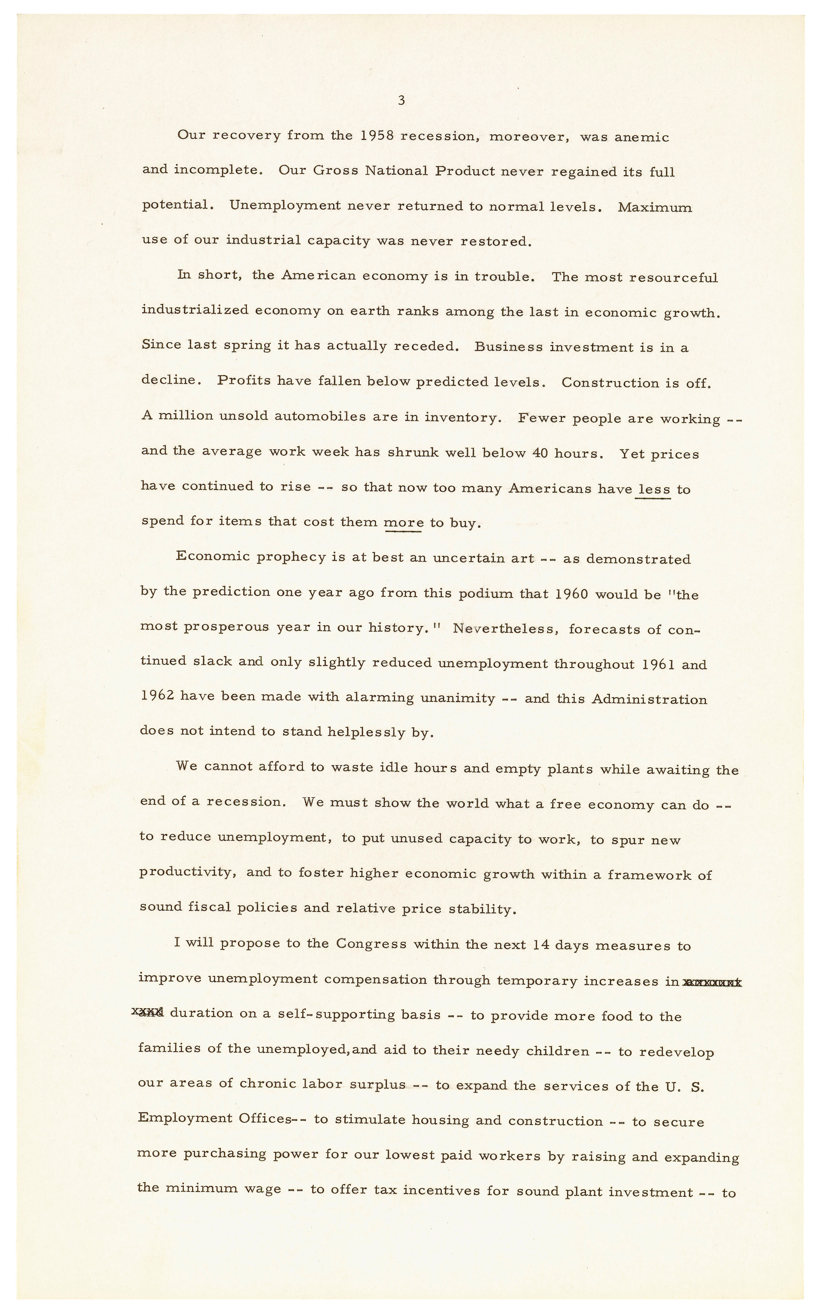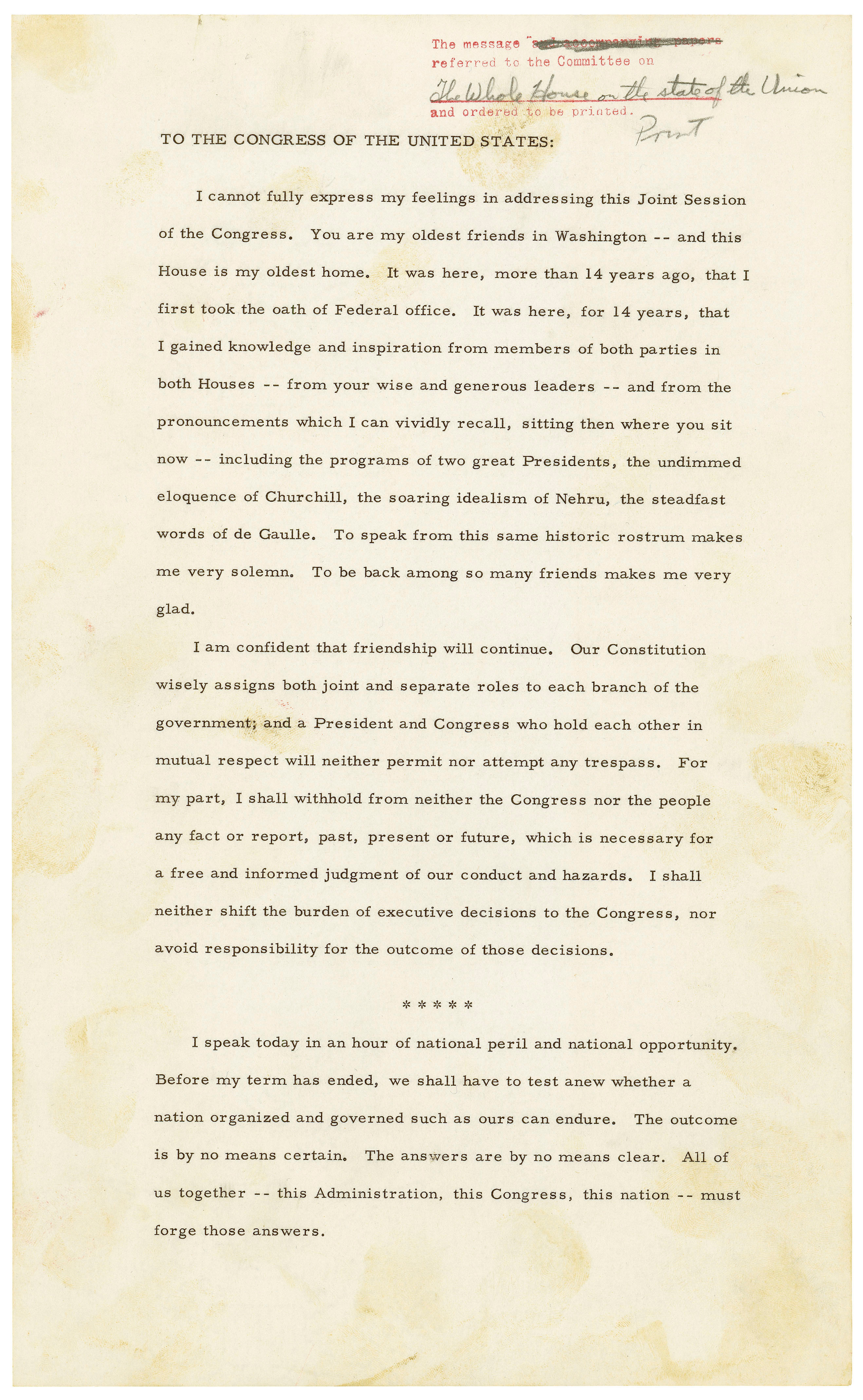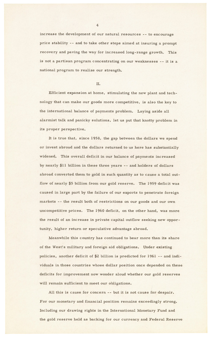 This message was given just 10 days after President Kennedy's inauguration, one of the few instances where the President chose to give a State of the Union at the beginning of his first term. In the message President Kennedy describes the country's economic turmoils and the perilous situation with foreign affairs. He candidly remarks that "Life in 1961 will not be easy. Wishing it, predicting it, even asking for it, will not make it so. There will be further setbacks before the tide is turned. But turn it we must."