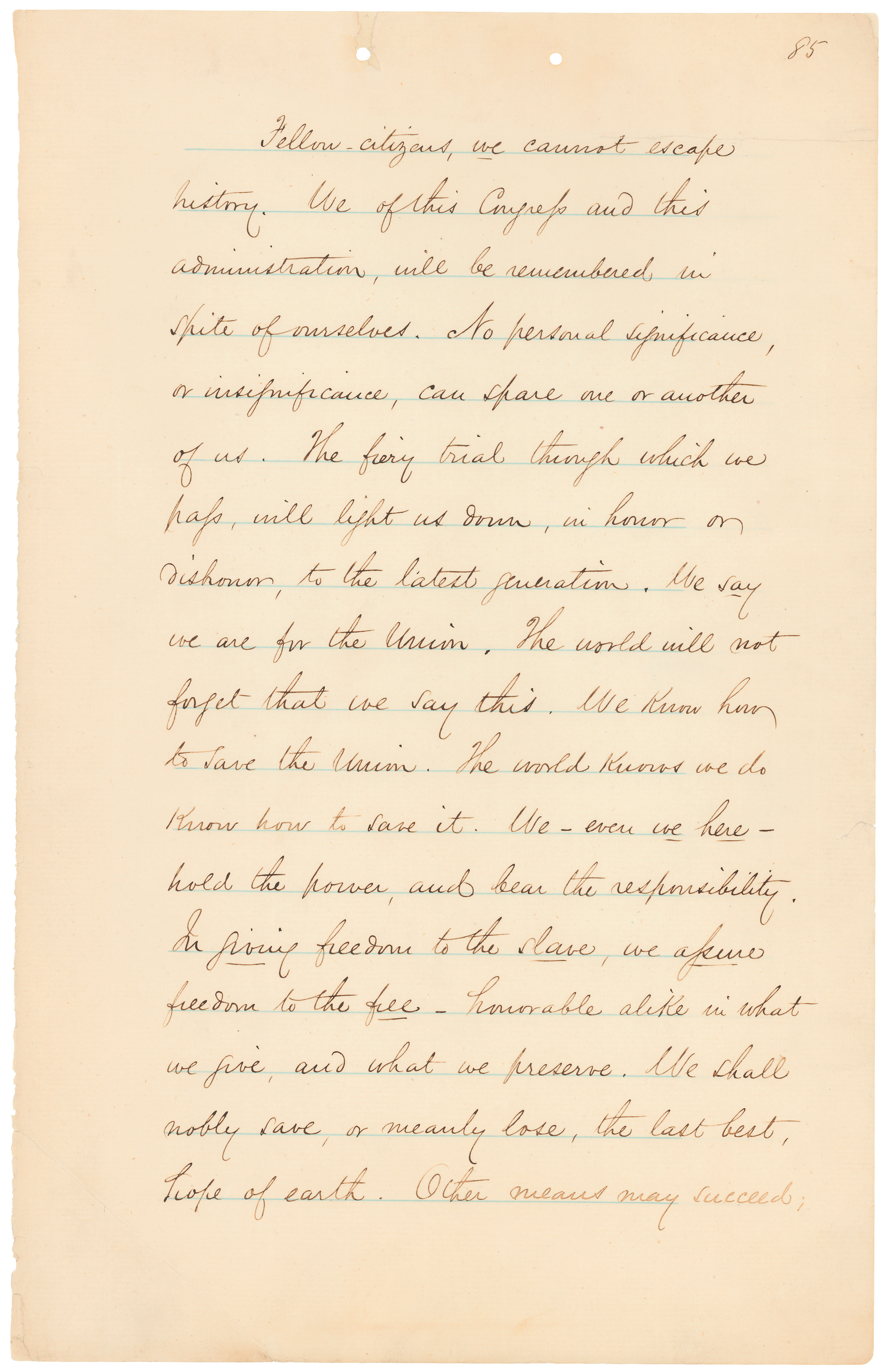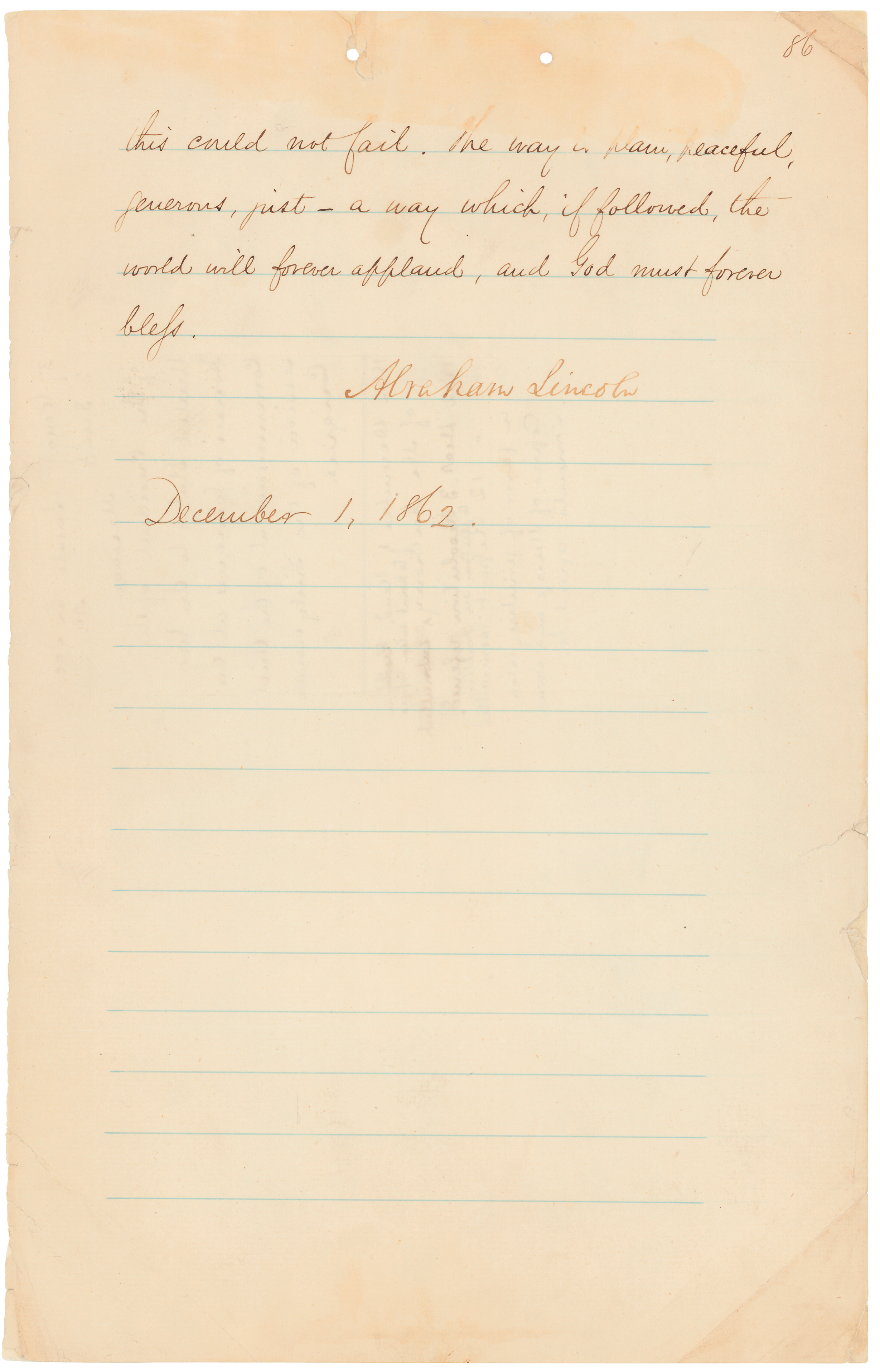 In this 1862 annual message President Lincoln sought to re-inspire Congress after the horrifying battle at Antietam—the bloodiest battle of the Civil War. Likening the war to a "fiery trial," Lincoln summons the Union to the great task of abolishing slavery, declaring that "in giving freedom to the slave, we assure freedom to the free." In the tradition of the time this annual message was read aloud not by Lincoln, but by the Secretary of the Senate.