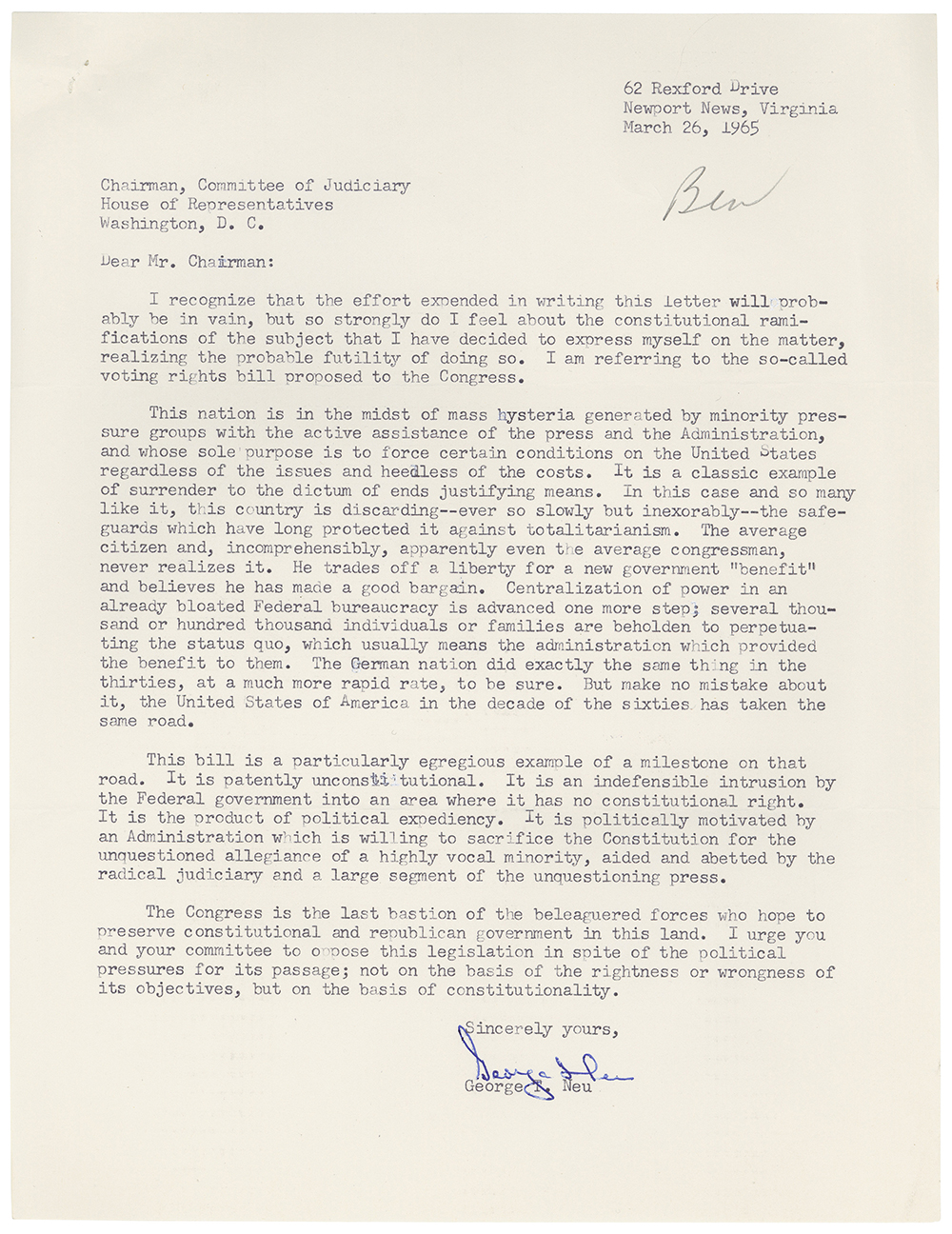 Letter from Mr. George Neu Against Voting Rights, March 26, 1965