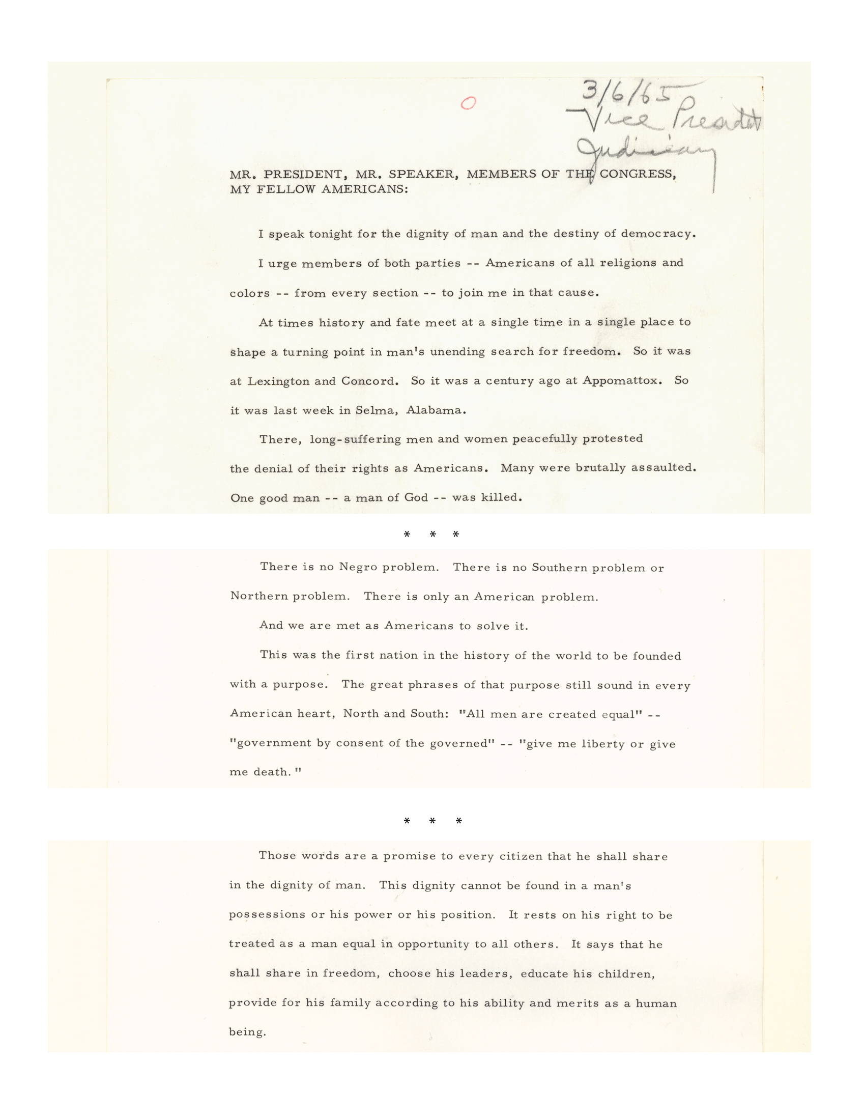 President Lyndon Johnson's speech to Congress on voting rights: The American Promise, March 15, 1965; Judiciary Committee, Accompanying papers, S. 1564 (SEN 89A-E12); 89th Congress; Records of the U.S. Senate, Record Group 46; National Archives, Washington, DC. View in National Archives Catalog. Document 3A
