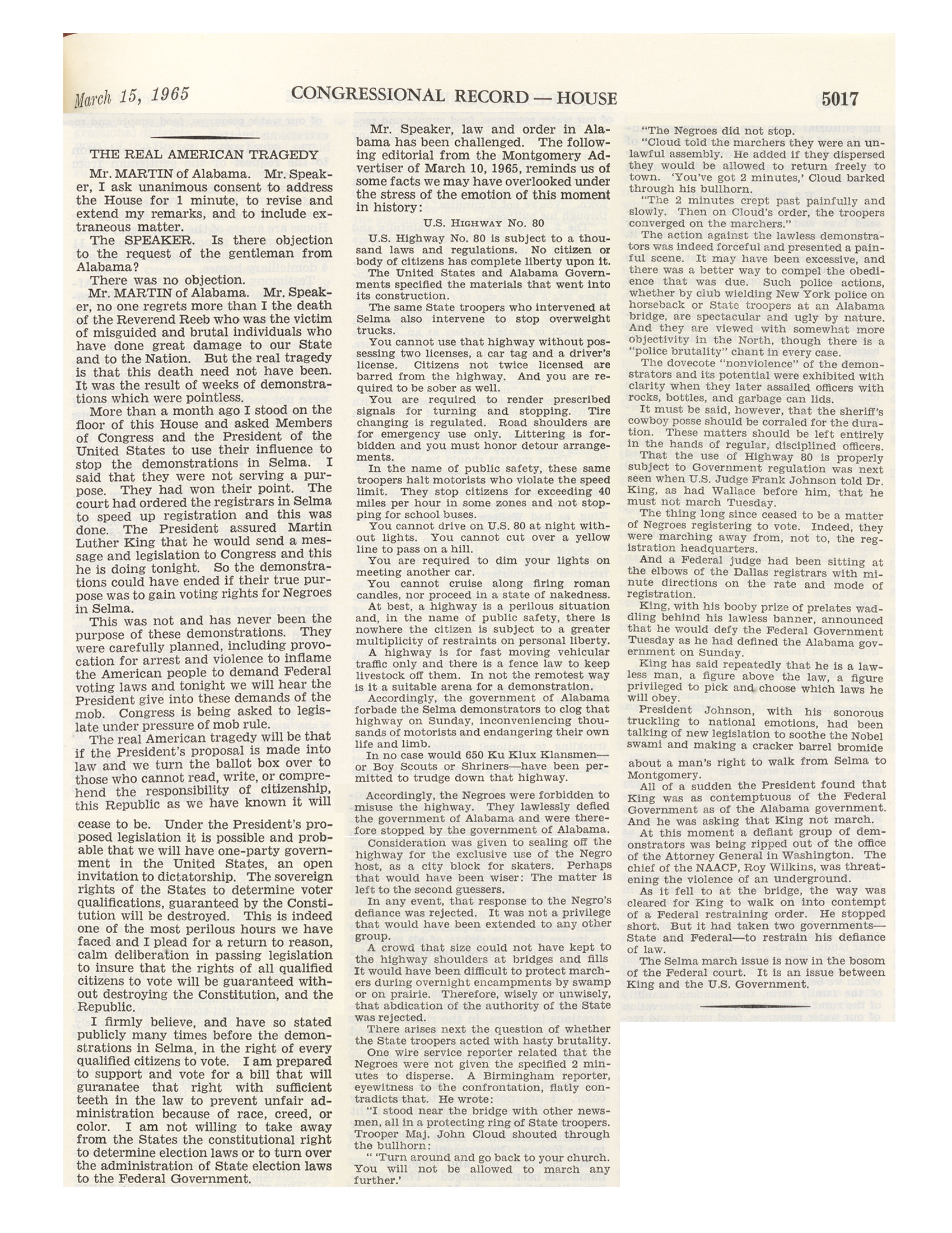 Congressman James Martin (AL). "The Real American Tragedy," Congressional Record Vol. 111, Pt. 4 (March 15, 1965) pp. 5017-5018. Document 1B