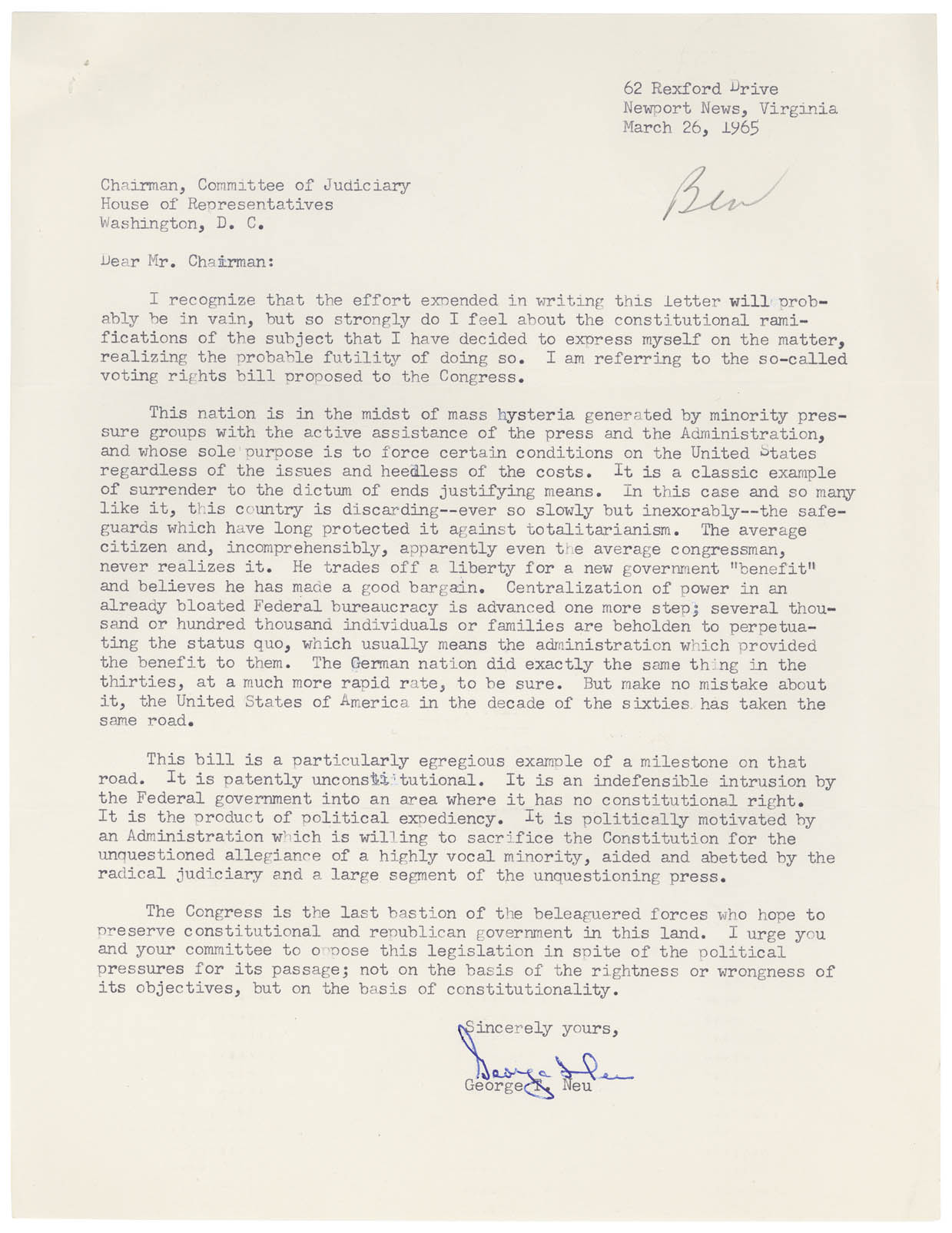 Letter from George Neu to the Chairman of the Judiciary Committee against the Voting Rights Act of 1965, March 26, 1965; Judiciary Committee, Legislative Files, House bills, H.R. 6400; 89th Congress; Records of the U.S. House of Representatives, Record Group 233; National Archives, Washington, DC. View in National Archives Catalog. Document 4B