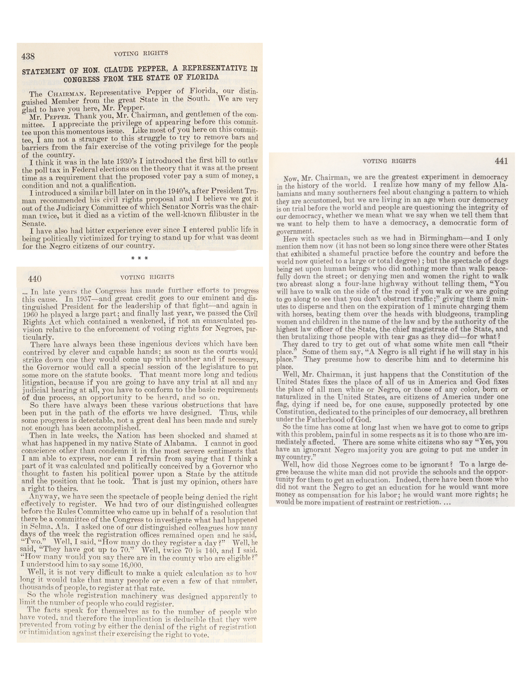 Statement of Congressman Claude Pepper. Hearings on H.R. 6400 and other proposals to enforce the 15th Amendment to the Constitution of the United States, March 24, 1965; 89th Congress;Washington: Government Printing Office, 1965. Document 5A