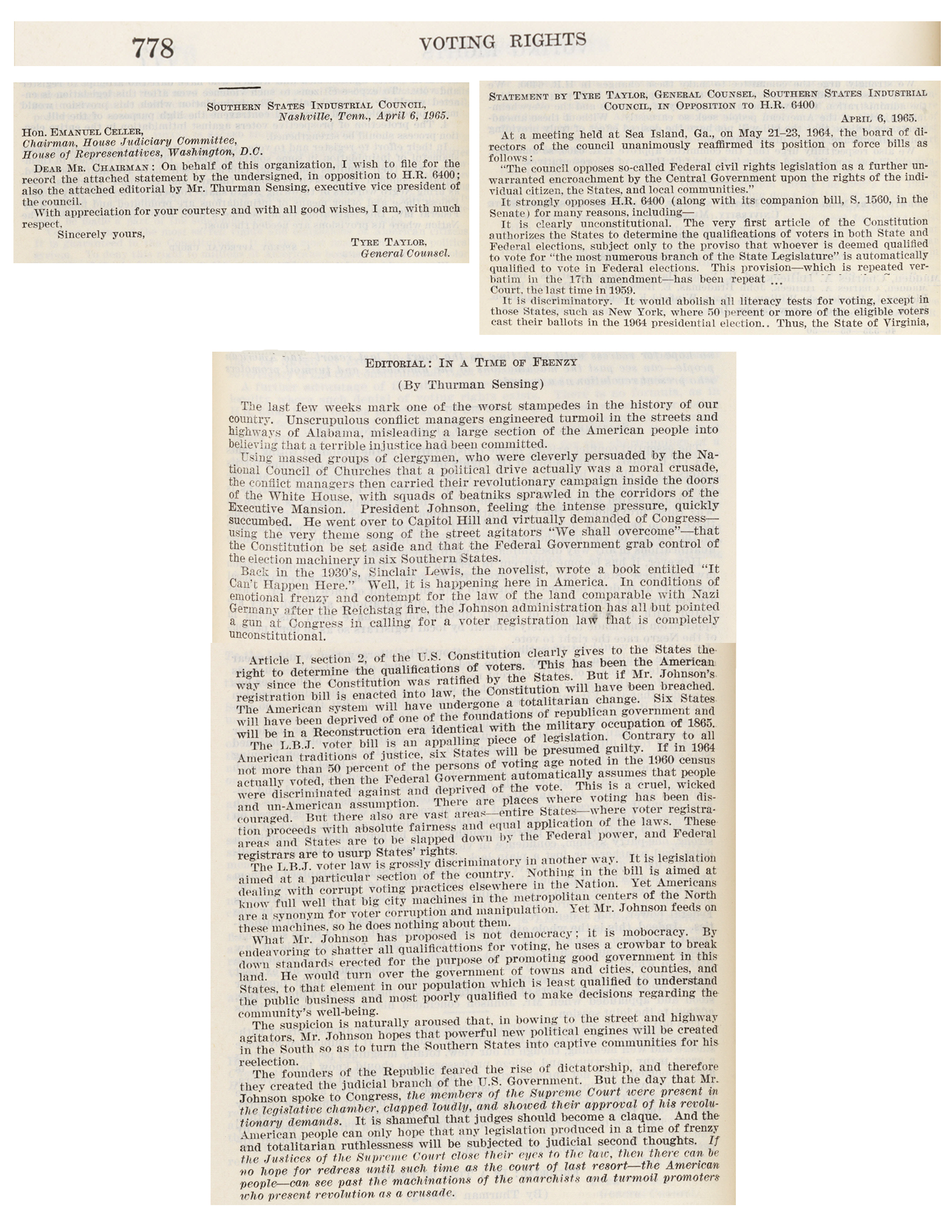 Statement and editorial from the Southern States Industrial Council. Hearings on H.R. 6400 and other proposals to enforce the 15th Amendment to the Constitution of the United States, April 6, 1965. 89th Congress. Washington: Government Printing Office, 1965. Document 3B
