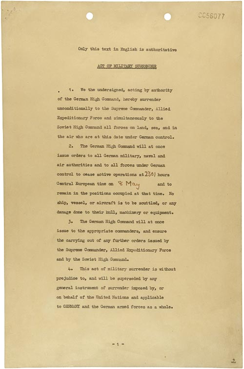This instrument of surrender was signed on May 7, 1945, at Gen. Dwight D. Eisenhower's headquarters in Reims by Gen. Alfred Jodl, Chief of Staff of the German Army.