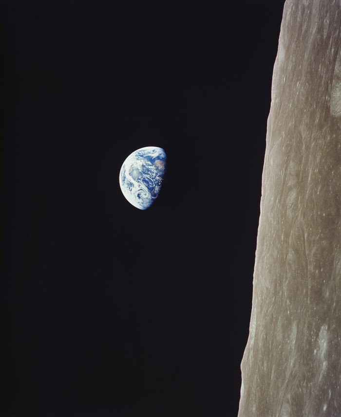Earthrise seen from Apollo 8. The astronauts saw the horizon vertically with the lunar surface to the right.