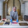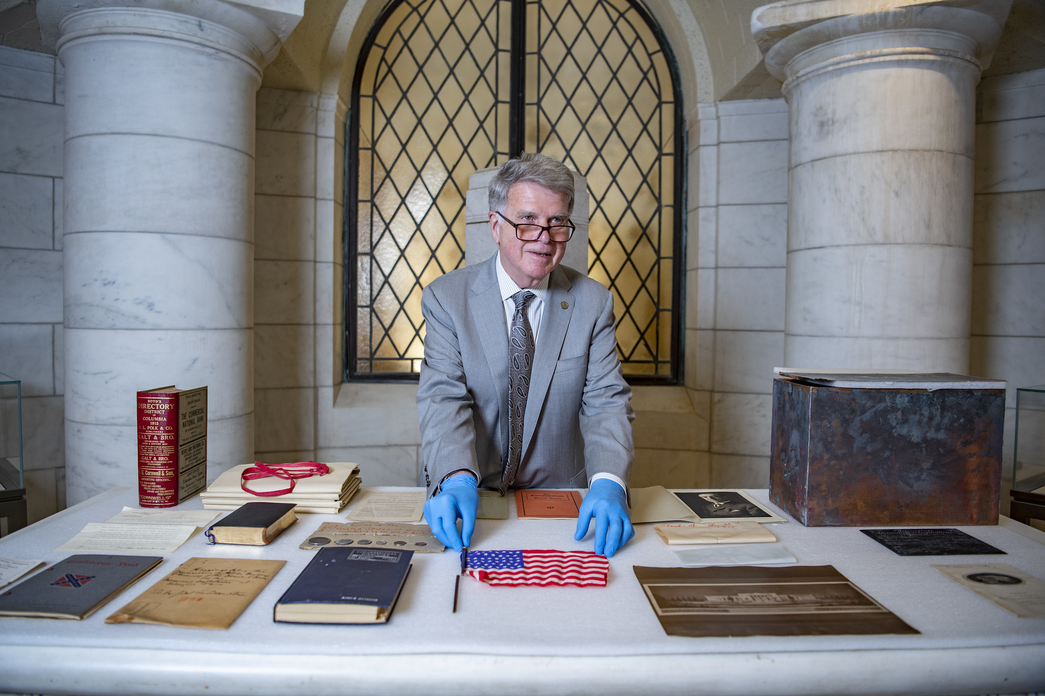 WASHINGTON, May 14, 2020 — As Arlington National Cemetery marks the centennial of its Memorial Amphitheater this week, Archivist of the United States David S. Ferriero joined its staff on site recently to view and discuss the contents of a 105-year-old time capsule stored behind a cornerstone.