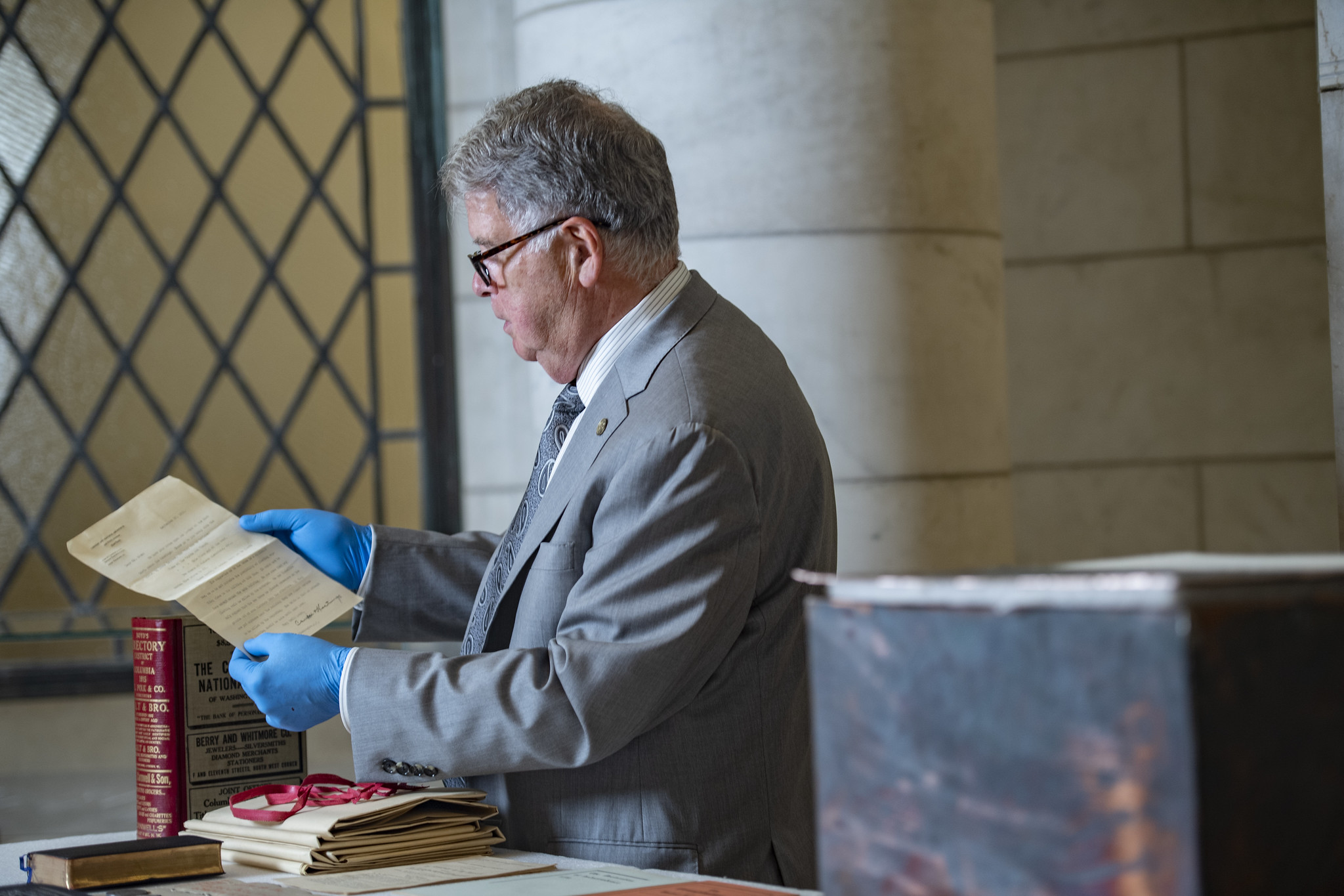 Among the artifacts removed from the boxes and viewed by the Archivist were U.S. coins and postage stamps in use in 1915; an autographed photo of President Woodrow Wilson; a map of Pierre Charles L'Enfant's design for Washington, DC; a U.S. flag; copies of the Declaration of Independence and the Constitution; a Bible; and other documents pertaining to the history of the amphitheater and the nation's capital.