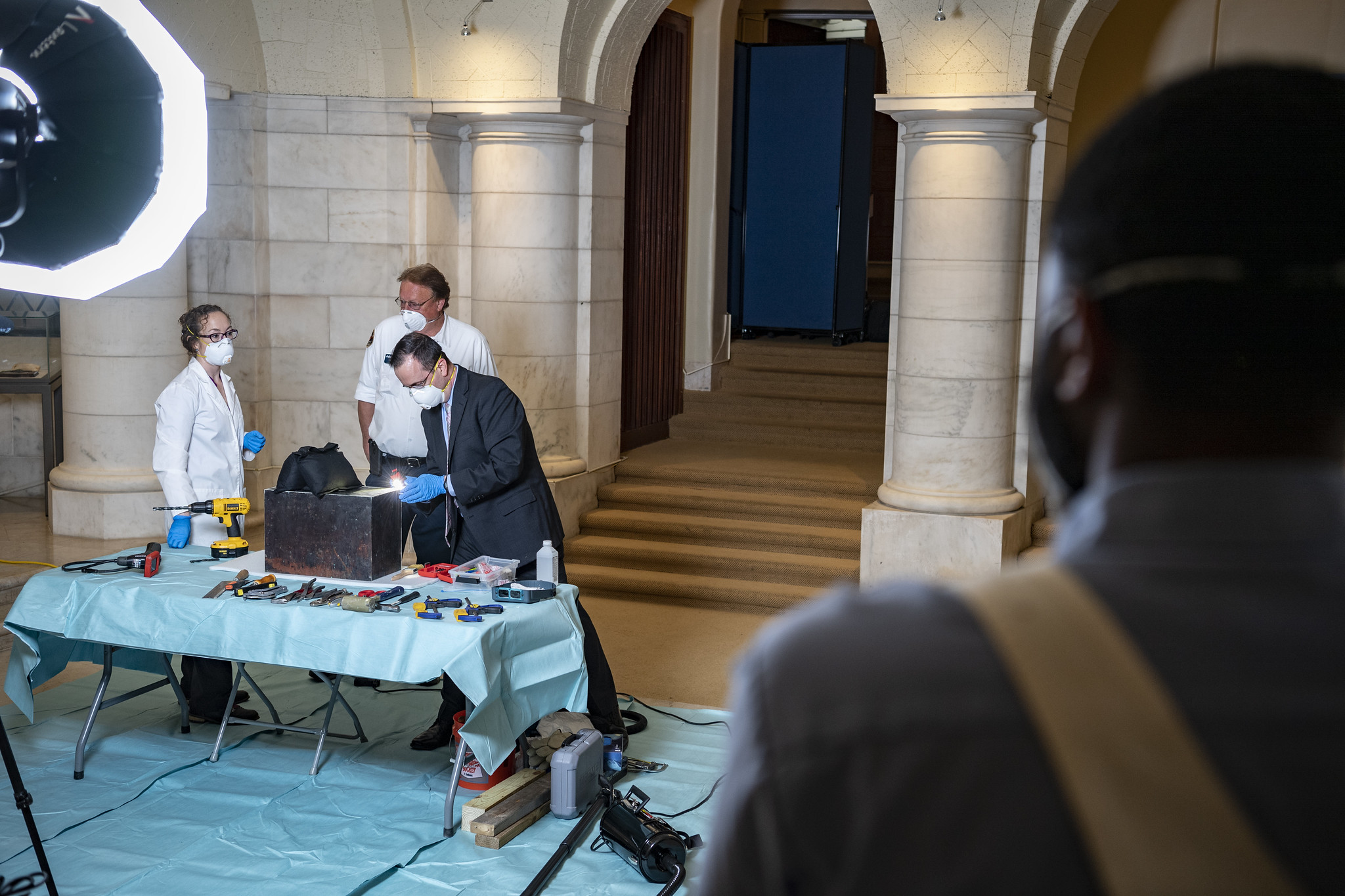 A historian, a conservator, and facilities maintenance employees from Arlington National Cemetery oversaw the extraction and opening of the copper box on April 9, 2020. Inside were items stored since construction began on the amphitheater in 1915.
