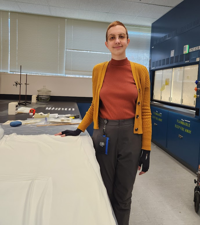 To conduct experiments relating to light degradation, one of the lab’s chemical fume hoods was converted to a large light box. For at least eight weeks, the fabric will remain under the intense light, and samples will be periodically removed to have their chemical and physical properties tested and monitored for changes.