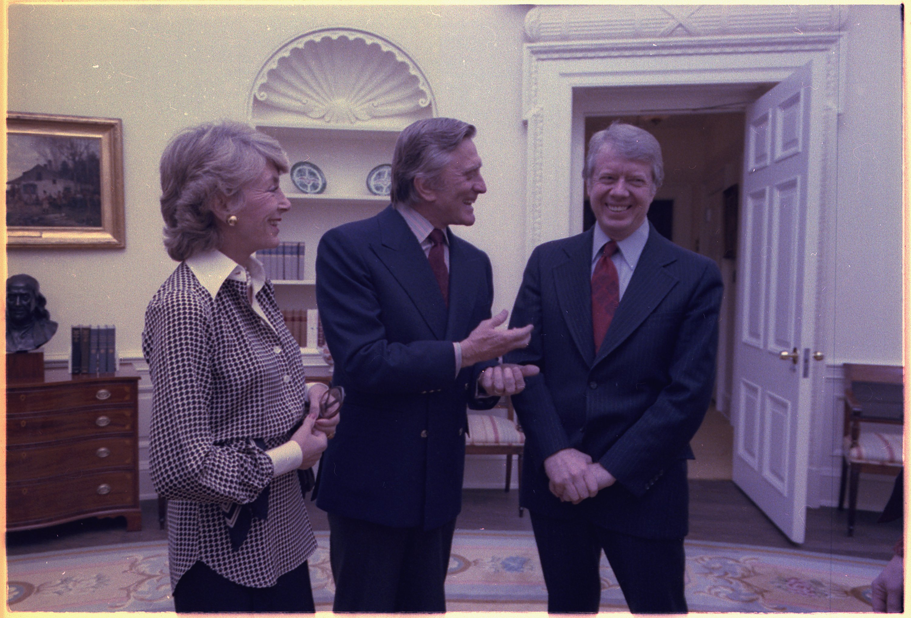 DownloadPrintPresident Jimmy Carter greets Kirk Douglas and his wife Anne Buydens, March 16, 1978. (White House Staff Photographers / Jimmy Carter Library; National Archives Identifier 178399)