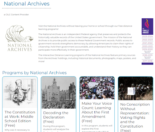 National Archives Distance Learning Program Wins Pinnacle Award for Fourth Consecutive Year