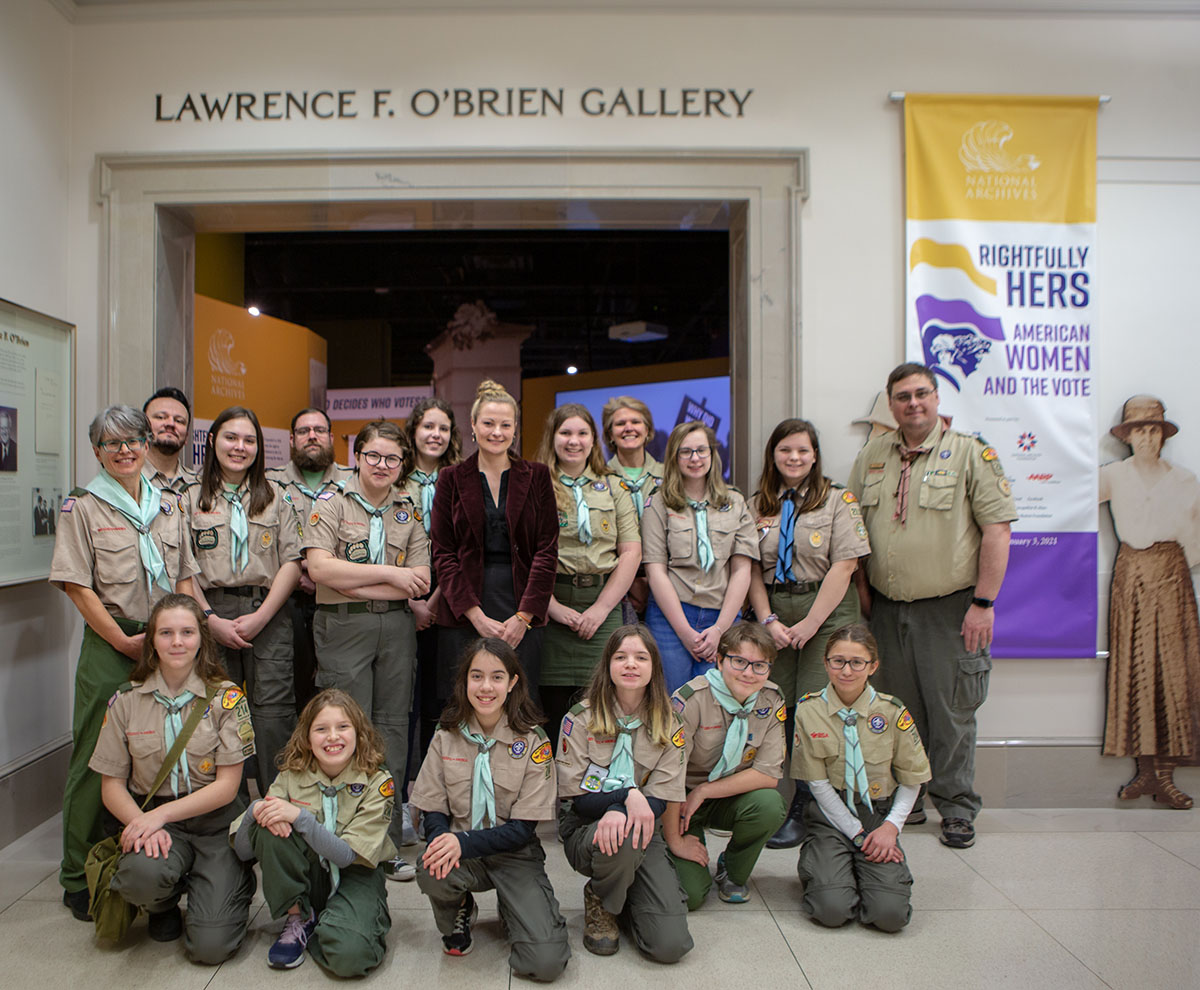 WASHINGTON, January 31, 2020 — As America celebrates the centennial year of the passage of the 19th Amendment, the National Archives has been a hub of activities and events honoring the occasion. For the Scouts of BSA Troops 214 and 2018—who hail from Crofton, MD, and Edgewater, MD, respectively—their January 30 visit to the National Archives Museum closely coincided with their first anniversary as Scouts BSA Troops.