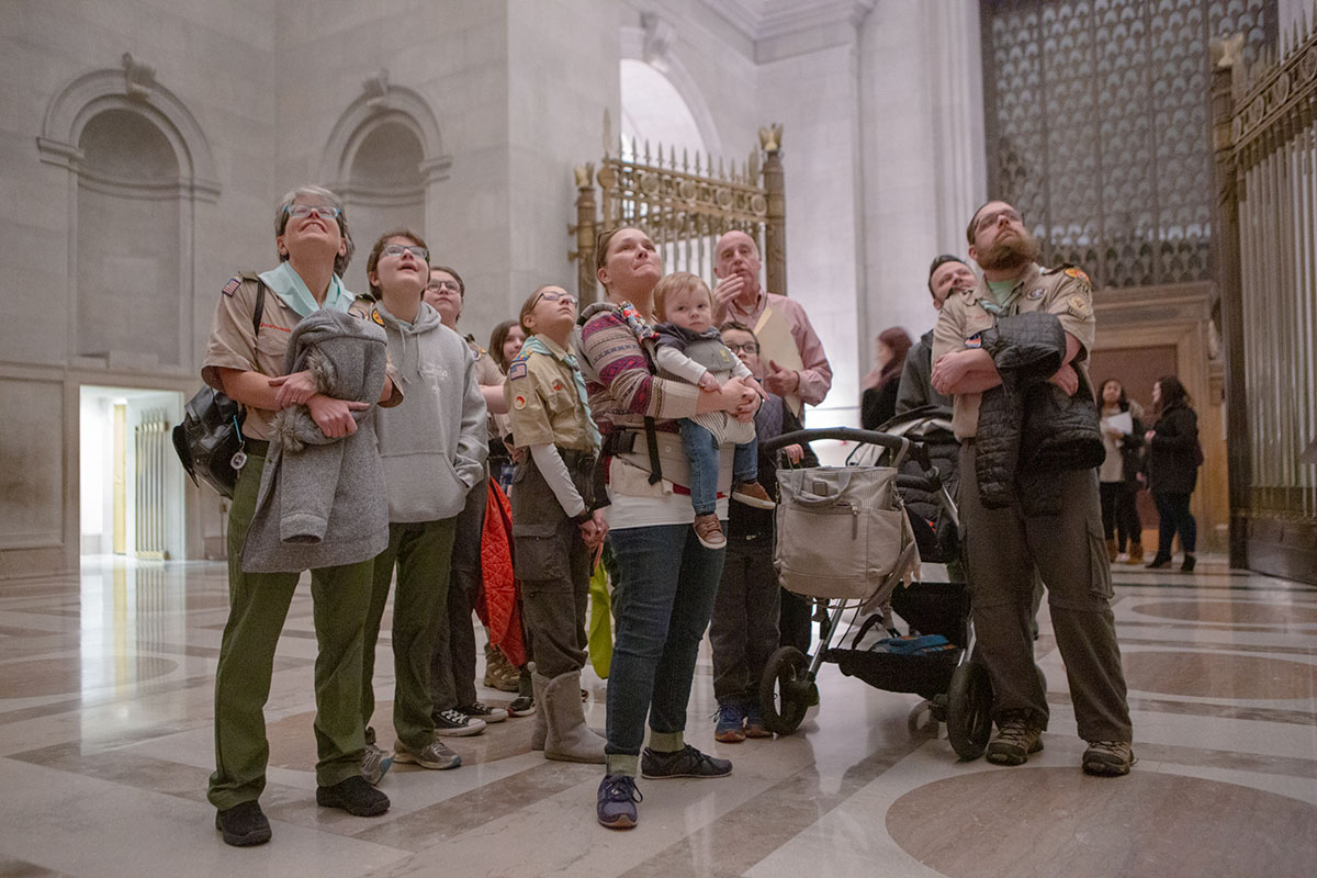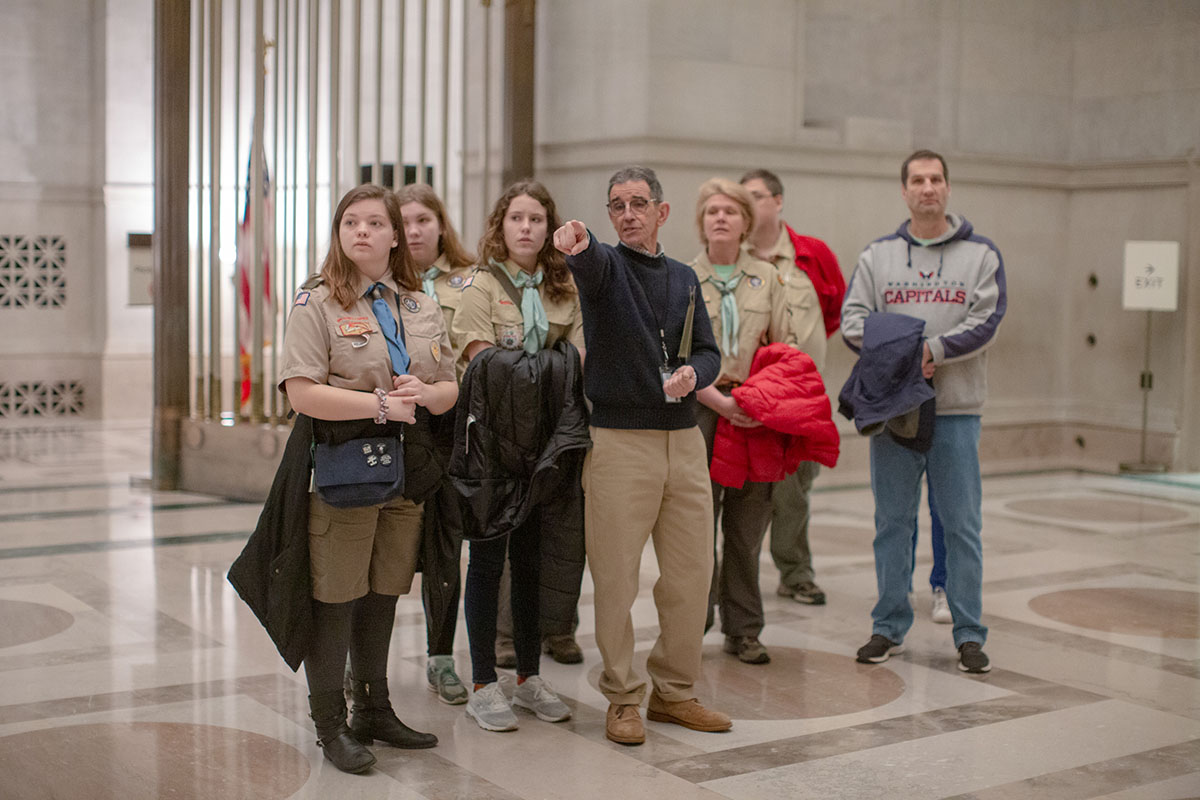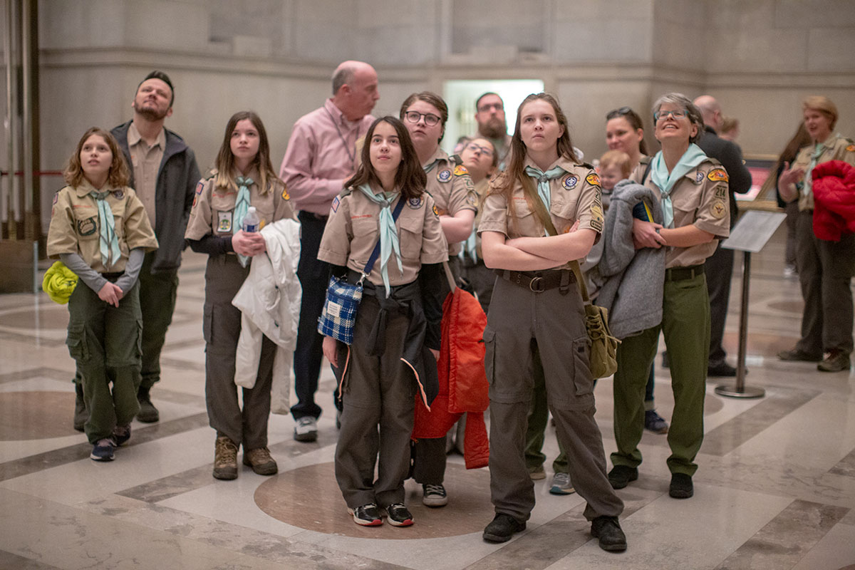 “Troop 214 was actually one of the first all-girls troops chartered by BSA,” Simpkins said as his Scouts stopped and viewed the Charters of Freedom in the Rotunda. “Chloe has been part of the troop since we stood up almost exactly one year ago on February 1, 2019.”