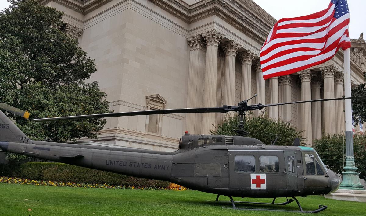 WASHINGTON, November 9, 2018 — Three Vietnam-era helicopters went on display this morning outside the National Archives in Washington, DC. Their pilots are also on hand, offering tours of the aircraft to the public and answering questions about their historic flying machines. The helicopters and their pilots will remain in place until November 16 as part of a week-long celebration honoring veterans.