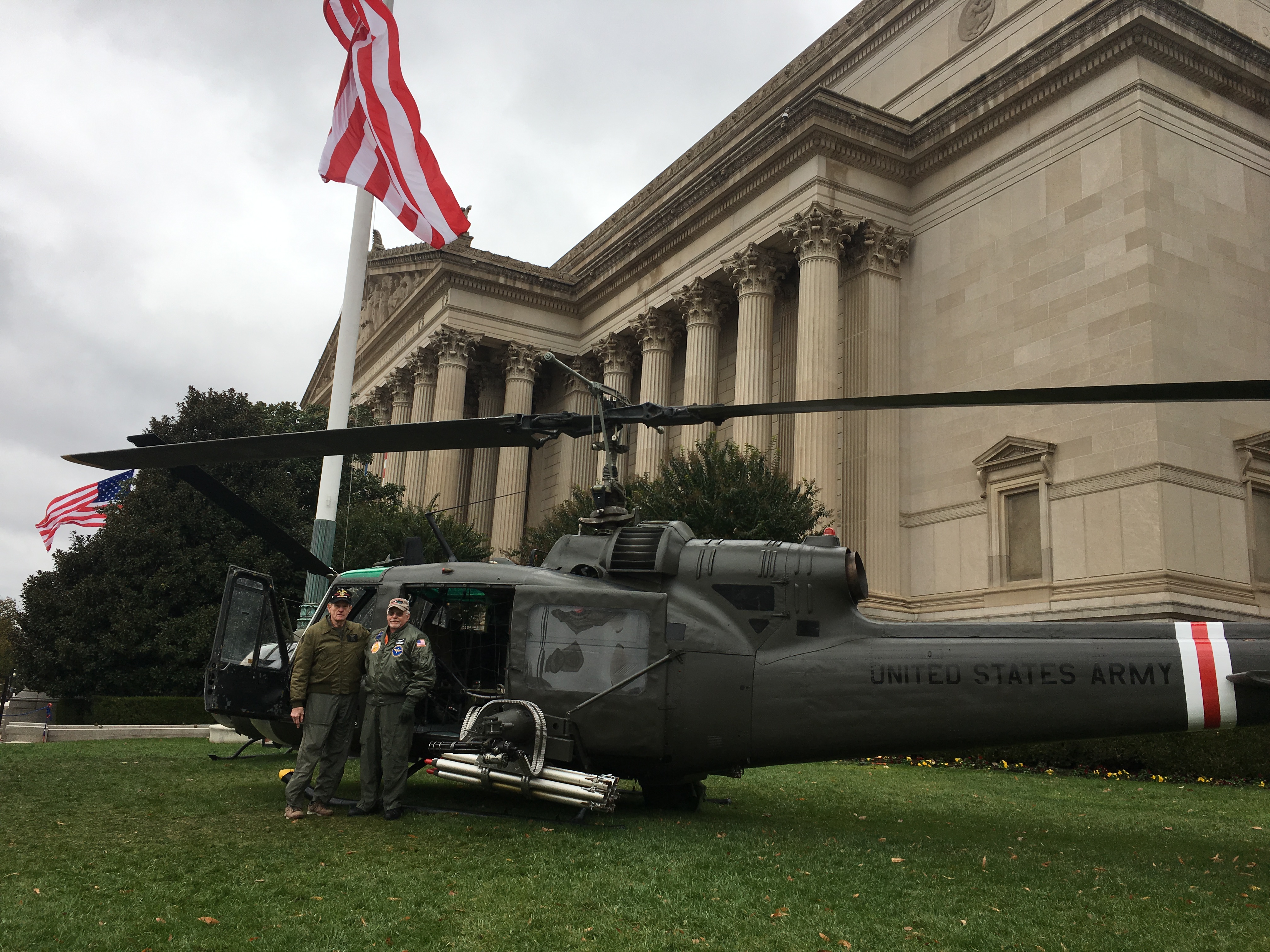 WASHINGTON, November 14, 2018 — When retired U.S. Army helicopter pilots George Chapman and Matthew McGuire heard about a Vietnam-era helicopter display this week on the National Archives lawn, they knew they had to visit Washington, DC, to see it. What made it especially inviting was the fact that one of the helicopters, the Bell UH-1M Iroquois, was the actual chopper they had flown into combat decades ago.