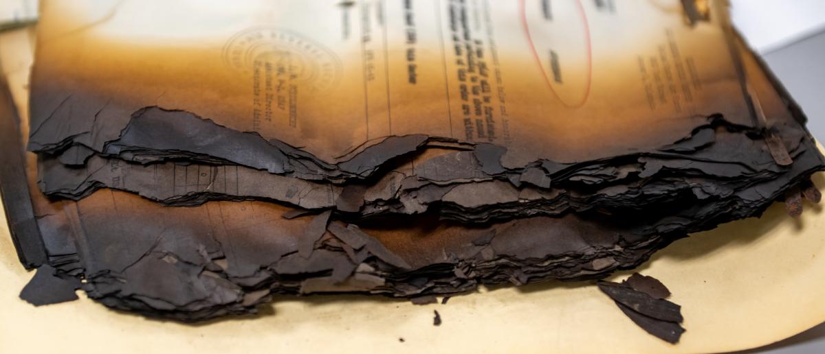 Notes: Headline photo by National Archives Preservation Technician Sean Derrick, St. Louis, MO, June 2023; grid "Photograph Documenting Damage Following the 1973 Fire at the Military Personnel Records Center in St. Louis, Missouri" (NAID: 176251164)