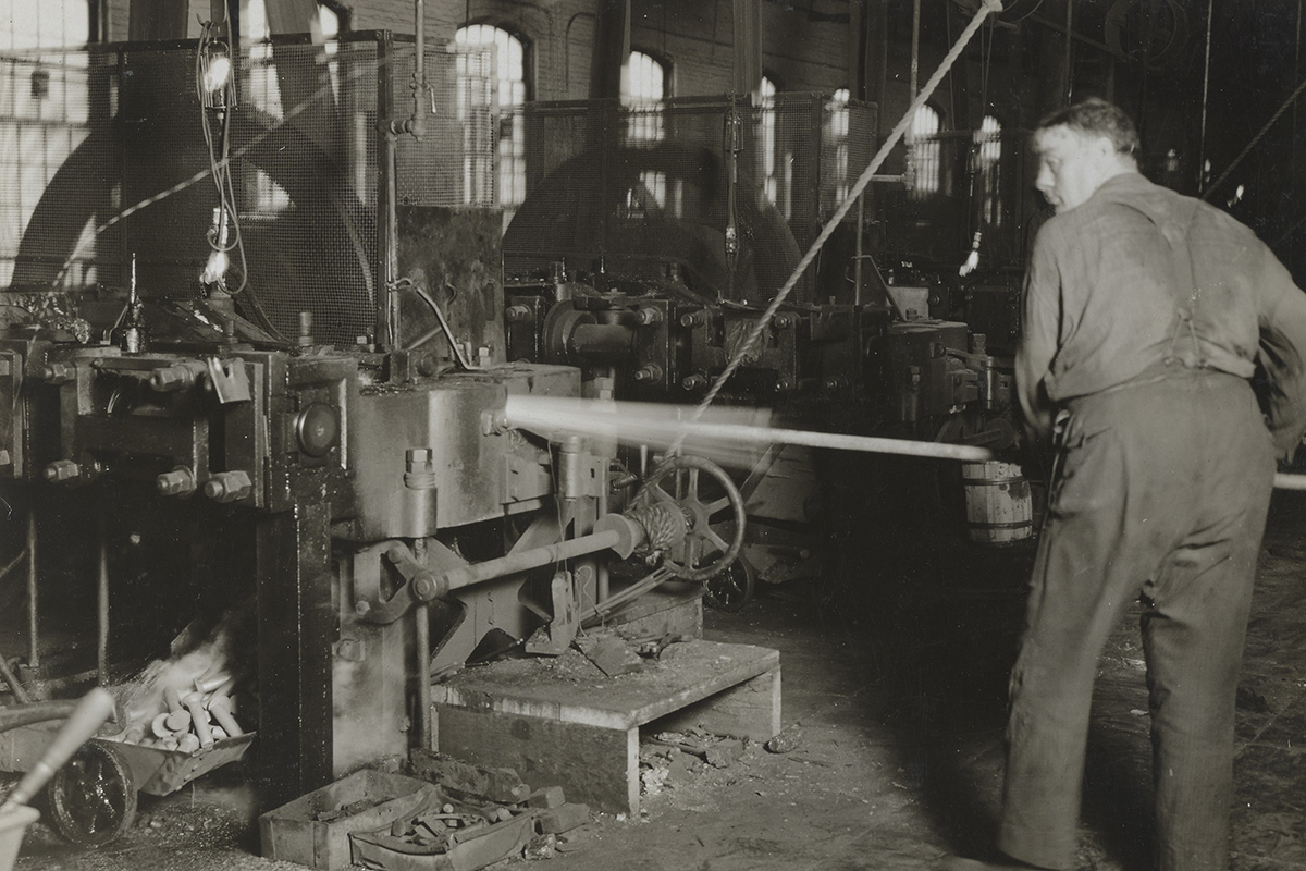 A man cuts rivet iron into rivets at the Burden Iron Company Foundry, Troy, NY, during World War I. View in National Archives Catalog