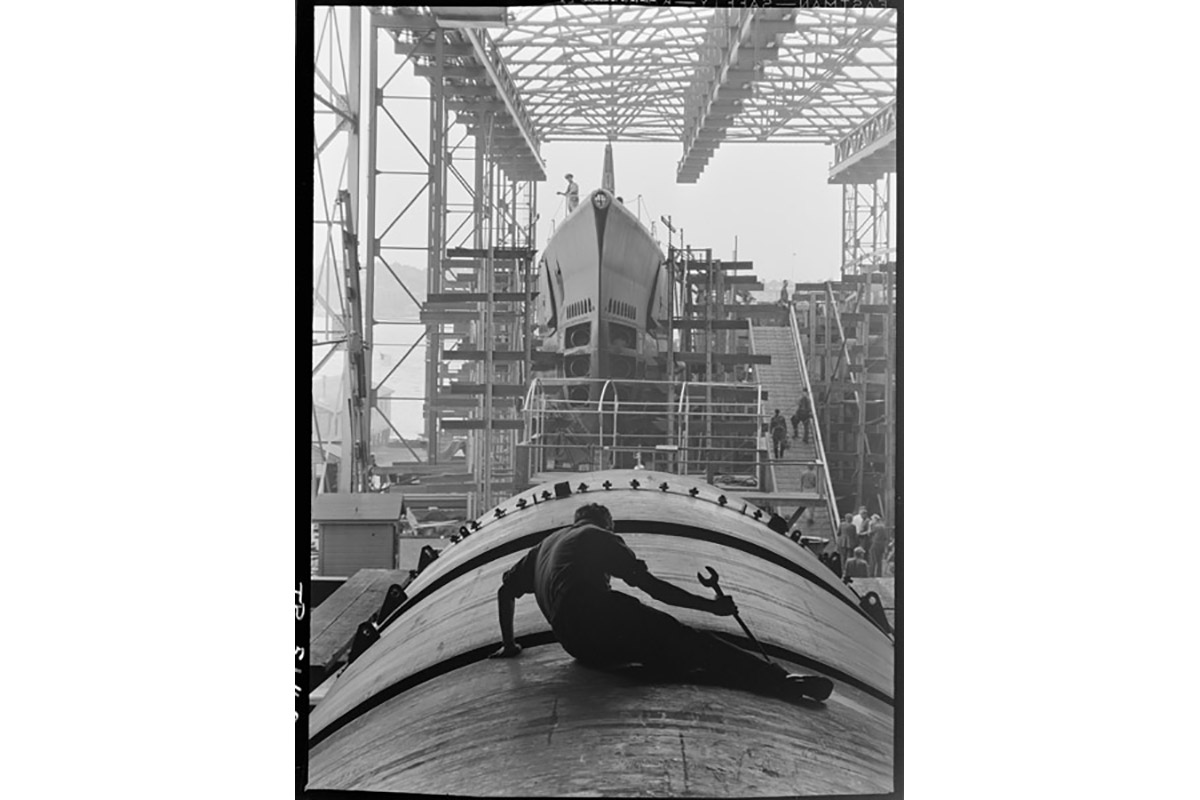 A man works on the hull of a submarine at Electric Boat Co., Groton, CT, during World War II. Photo by Fenno Jacobs. View in National Archives Catalog