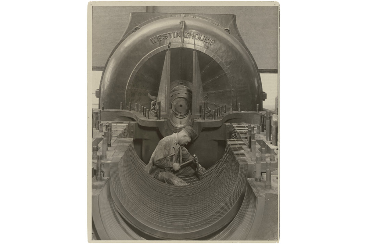 A worker in the turbine power house of the Pennsylvania Railroad, 1924. Photo by Lewis Hine. View in National Archives Catalog