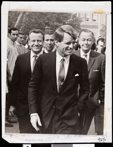 Robert F. Kennedy with California Assembly Speaker Jesse Unruh (left) and former USC President Norman Topping (right) during a 1965 visit to campus. Photo courtesy USC Archives.