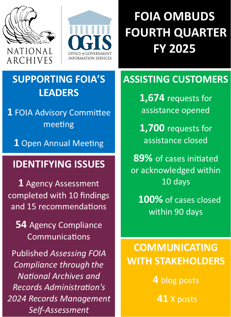 Quarterly data for the fourth quarter of fiscal year 2025 from the FOIA Ombuds office.