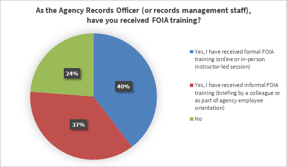 The majority of survey respondents said that their agency records officer (ARO) or records management (RM) staff have received formal or informal FOIA training. Forty percent of respondents said that their ARO or RM staff received formal FOIA training such as online training or in-person instructor-led training. Thirty-seven percent of respondents said that they received informal FOIA training such as a briefing or as part of their agency’s employee orientation process. Twenty-four percent of respondents said that their ARO or RM staff did not receive any FOIA training. (Percentages are rounded up and may not equal 100 percent.)
