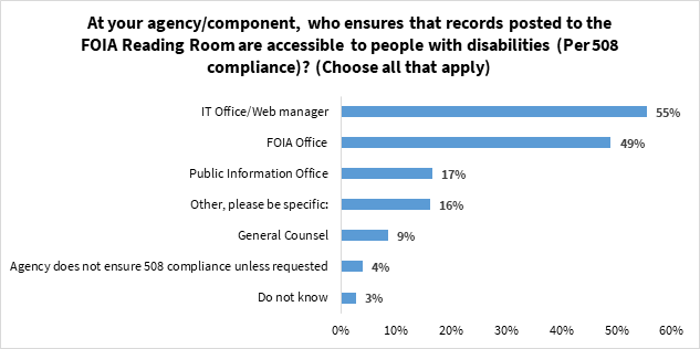 - A majority of respondents (55 percent) reported that agency IT Offices/Web managers are responsible for ensuring that records posted to FOIA reading rooms comply with Section 508 of the Rehabilitation Act, as amended. About half (49 percent) of the respondents indicated that the responsibility rests with the FOIA office. (Relates to FOIA Advisory Committee Recommendation Nos. 2018-05 and 2018-06)