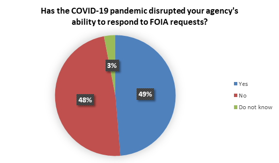 - Nearly half of all respondents (49 percent) reported that the COVID-19 pandemic disrupted their agency's ability to respond to FOIA requests.