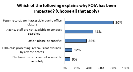 In response to Question 53, “Which of the following explains why FOIA has been impacted? (Choose all that apply),” the majority of respondents said that paper records were inaccessible due to office closures (80 percent) and agency staff were not available to conduct searches (46 percent). Thirty-six percent answered, “Other, please be specific;” 12 percent said that their agency’s FOIA case processing system was not available by remote access; and 9 percent said that electronic records were not accessible remotely.