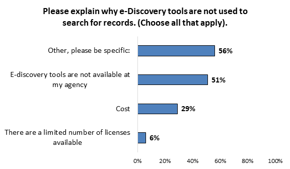 Respondents who answered “other, please be specific,” (56 percent) cited the following as reasons why their agencies do not use e-discovery tools to search for records.