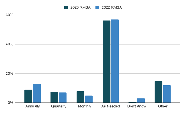 The second FOIA question in the 2023 RMSA is repeated from the 2022 RMSA and asks respondents to describe how often they proactively (i.e., before receiving any FOIA requests for the information) make records public by posting information appropriate for the public. There were 278 responses to this question for 2023. The most common response was “as needed” (59 percent); 9 percent of respondents reported making proactive disclosures annually; 8 percent reported making proactive disclosures monthly; and 8 percent reported making proactive disclosures quarterly. The remaining options were: “other, please explain” (15 percent) and “do not know” (0.4 percent).