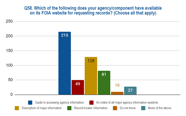 Question 58 in the 2023 RMSA was repeated from the 2019 RMSA. Its inclusion in that RMSA laid the foundation for an OGIS issue assessment —subsequently published on November 28, 2022—about the information agencies publish on their websites, including information to facilitate FOIA requests. The 2022 OGIS assessment fulfilled FOIA Advisory Committee Recommendation No. 2020-01 to help facilitate the FOIA filing process and inform OIP guidance on how agencies can improve online descriptions of the FOIA process.